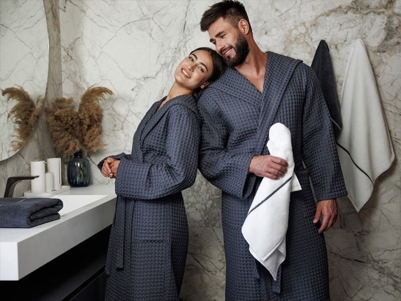 Это может быть уютный махровый, легкий вафельный или гладкотканый халат. Когда халаты и полотенца выполнены в одной фактуре и цвете — это удобно и эстетично.