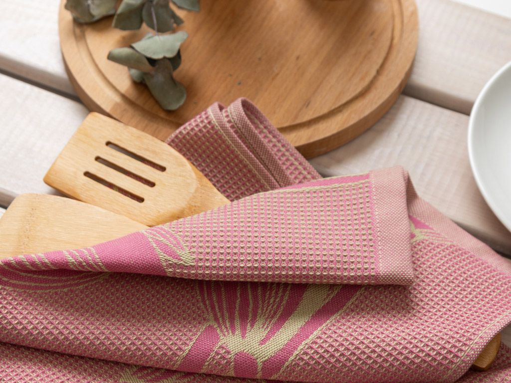 Изделия из льна обладают максимальной прочностью и износостойкостью, хорошо впитывают влагу, быстро сохнут, имеют природные антибактериальные свойства, не линяют и не скатываются. Они чуть более грубые на ощупь, чем хлопковые изделия, но достаточно постирать их несколько раз, и фактура станет более мягкой. Они прекрасно подходят для протирания стеклянной и фарфоровой посуды, поскольку не оставляют разводов и ворсинок.