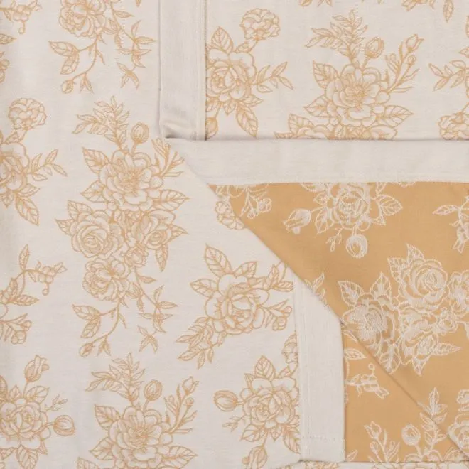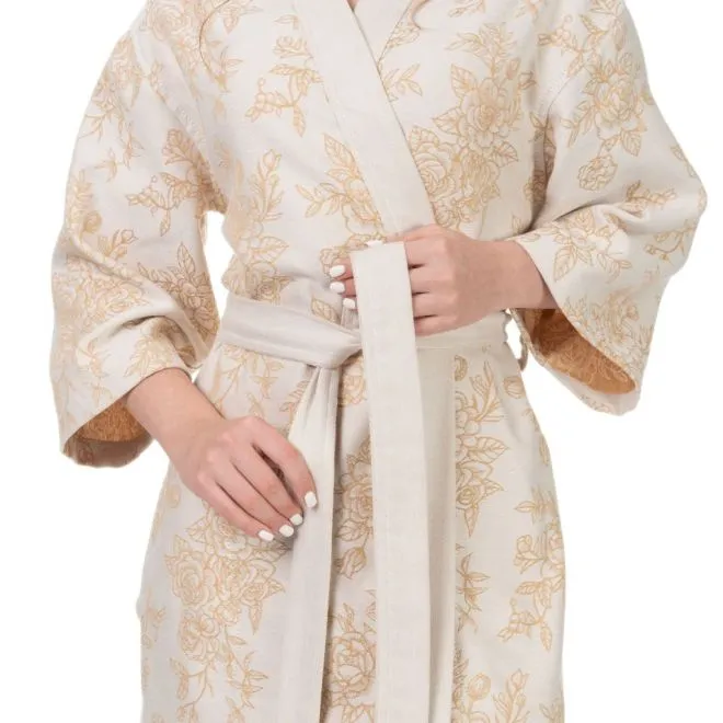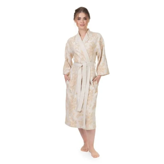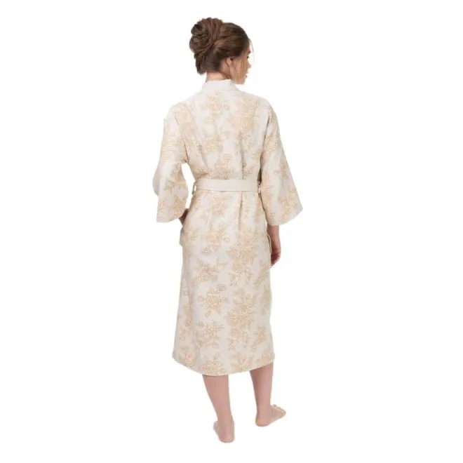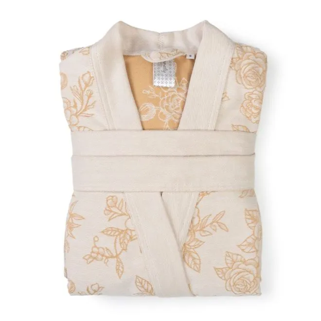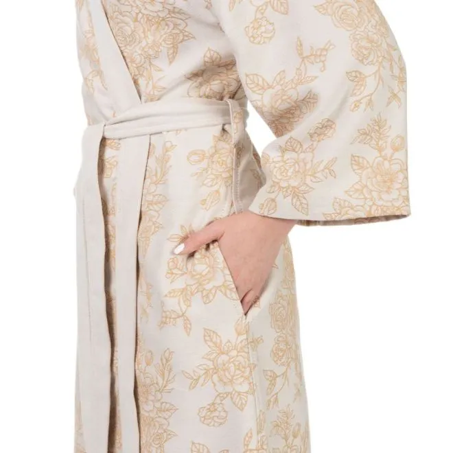 Халат украшен эффектным цветочным принтом в двух оттенках, а разработка – чередование петель двух основных цветов – создает эффект третьего цвета. Сочетание молочного оттенка и цвета карри вызывает ассоциации с латунью, которую любит стиль винтаж. Контрастная планка и пояс кремово-молочного цвета балансируют цветочный рисунок и придают халату современный характер.
