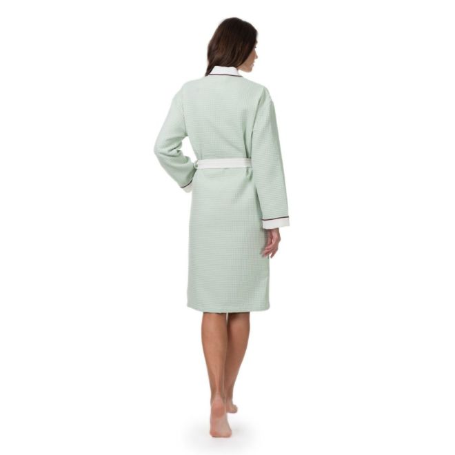Халат с крупными ячейками дополнен поясом и накладными карманами.