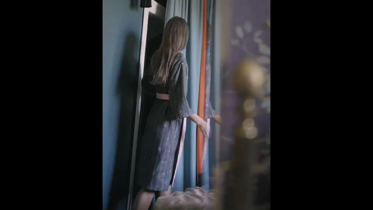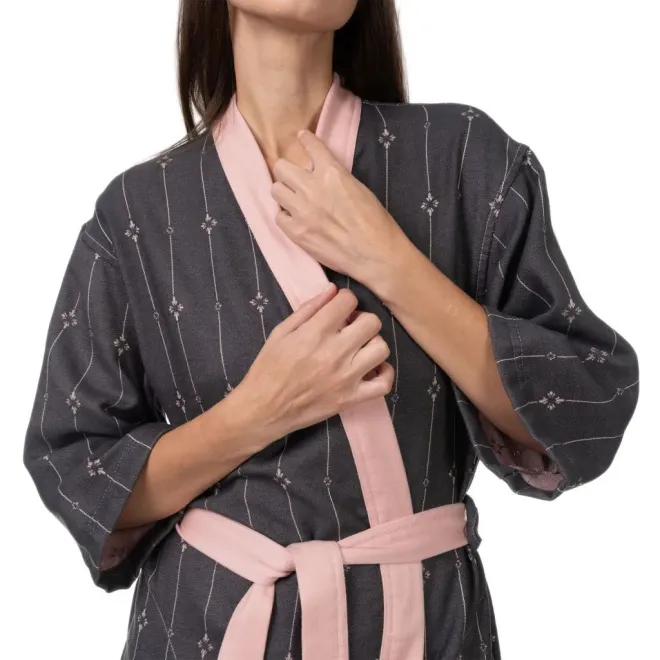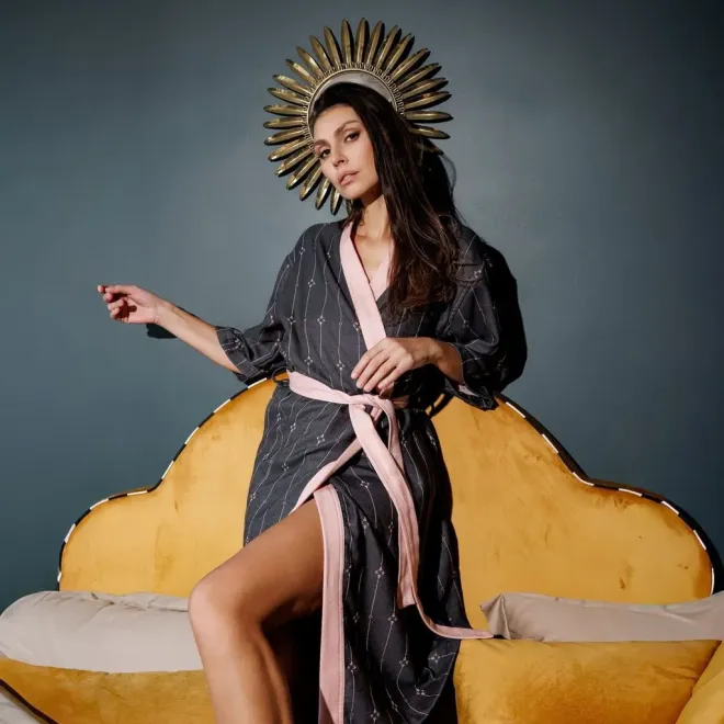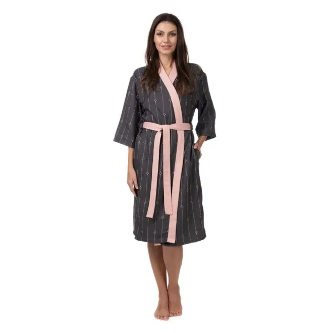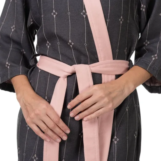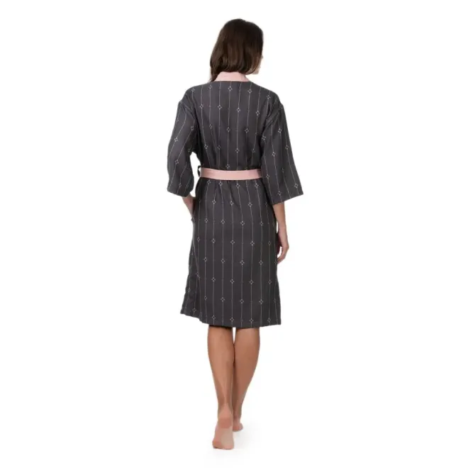 Модель длиной на 10 см ниже колен дополнена контрастным воротником-планкой, поясом и втачными карманами. Халат прекрасно садится по фигуре и выглядит стильно благодаря спущенной линии плеча и длине рукава 3/4.