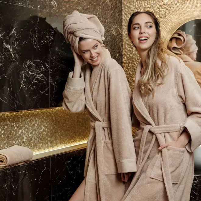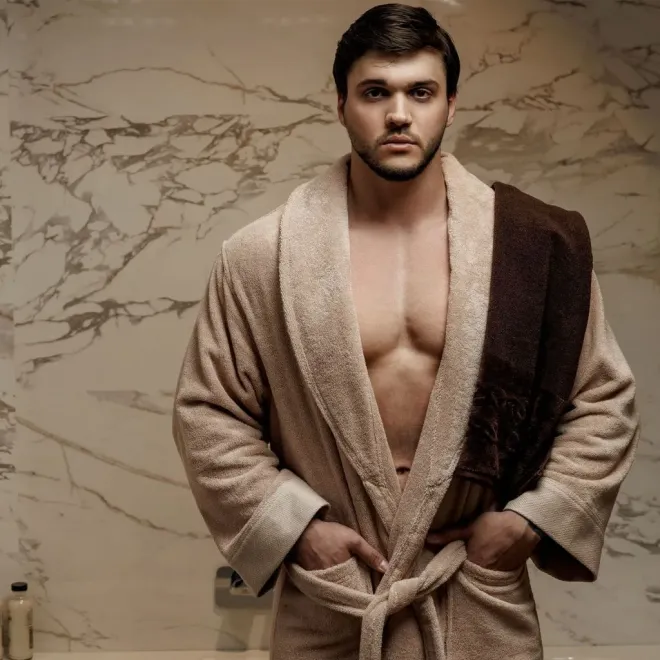 Халат из натурального хлопка – эффектный подарок для себя и близких. Комплект ему могут составить махровые полотенца и коврик для ванной.