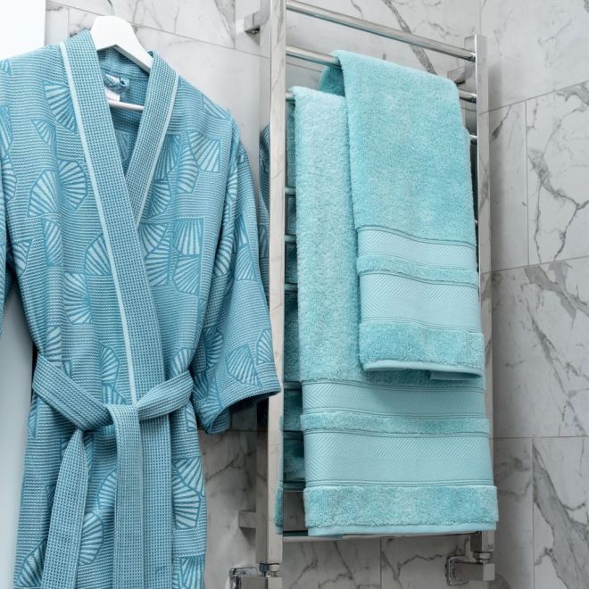 Халат из натурального хлопка – эффектный подарок для себя и близких. Комплект ему могут составить махровые полотенца и коврик для ванной.