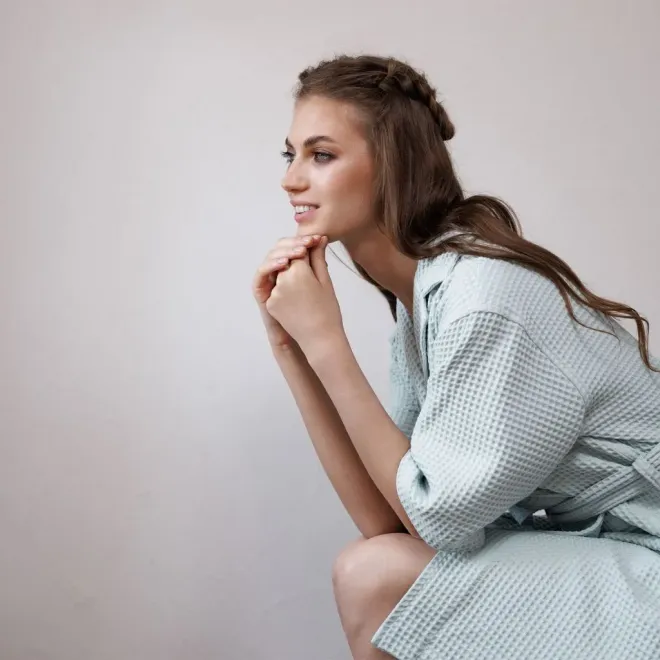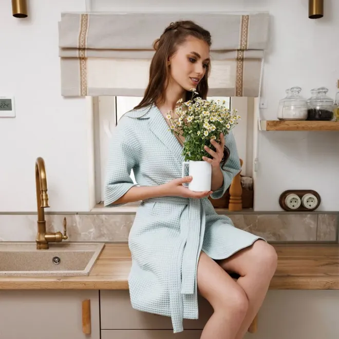 Легкий вафельный халат – всегда актуальный подарок для себя и близких. Его можно приобрести отдельно, либо в комплекте с полотенцами, мужскими халатами и ковриками для ванной из той же коллекции. Все изделия коллекции Alma di boho представлены в разделе «Интерьерные коллекции» -> «Для ванной» -> «Бохо». Узнать больше о стилистике и особенностях коллекции вы сможете в статье нашего блога.