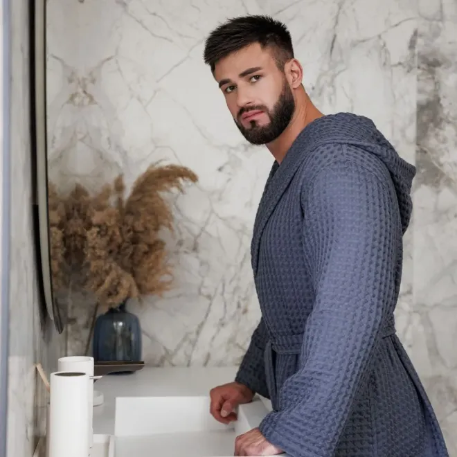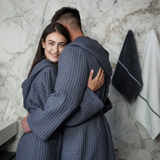 Рельефный халат из натурального хлопка – желанный презент для себя и близких. С помощью этих моделей в стиле «унисекс» вы можете создать парный образ со своей второй половинкой и обмениваться халатами по настроению. В комплект к халатам вы можете приобрести махровые полотенца и коврик для ванной из коллекции Base del comfort.