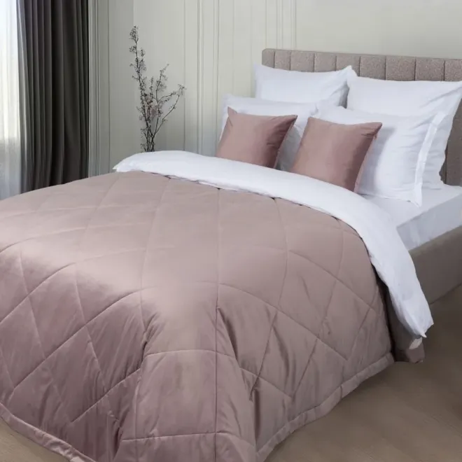 С лицевой стороны изделие выполнено из качественного полиэфира с приятной бархатной поверхностью, а с изнаночной – из микрофибры с эффектом велюра, которая предотвращает скольжение изделия по кровати. Внутри покрывала – «дышащий» полиэфирный наполнитель, который обеспечивает комфортную мягкость. Стеганый узор в виде ромбов придает изделию особую текстуру и объем, создавая уютный и стильный образ спальни.