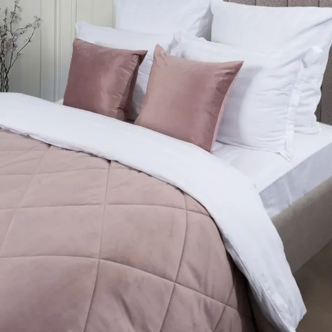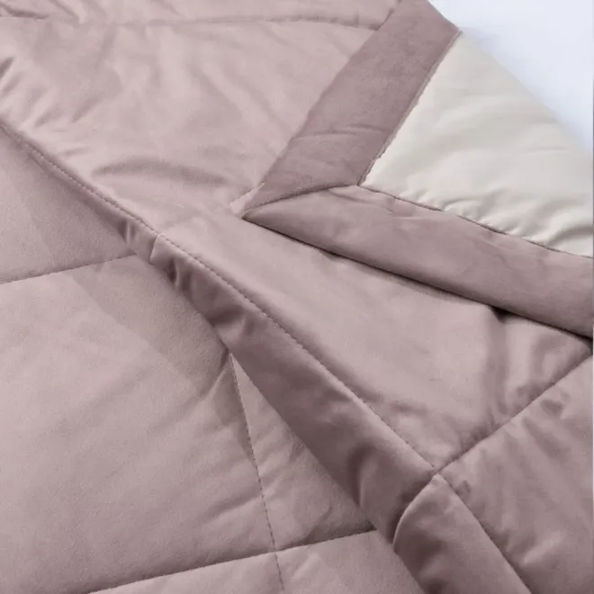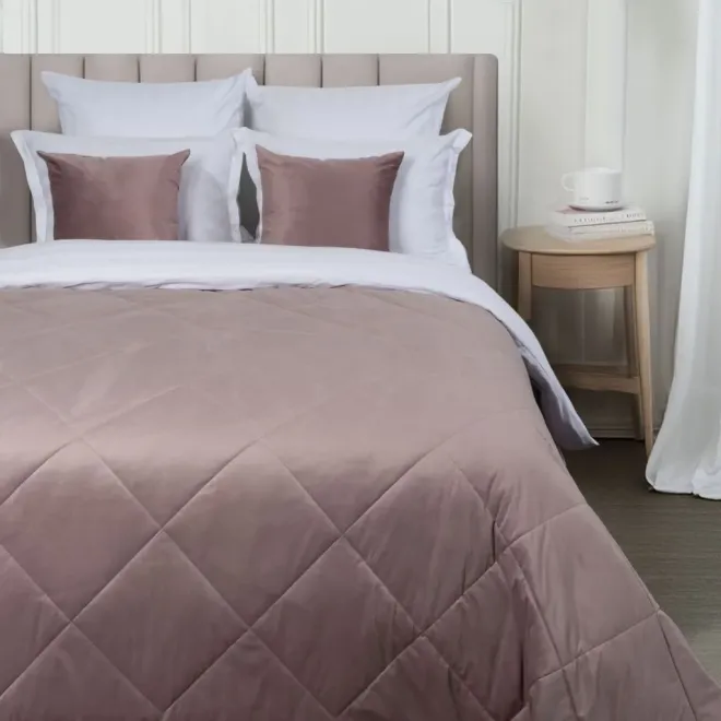 С лицевой стороны изделие выполнено из качественного полиэфира с приятной бархатной поверхностью, а с изнаночной – из микрофибры с эффектом велюра, которая предотвращает скольжение изделия по кровати. Внутри покрывала – «дышащий» полиэфирный наполнитель, который обеспечивает комфортную мягкость. Стеганый узор в виде ромбов придает изделию особую текстуру и объем, создавая уютный и стильный образ спальни.