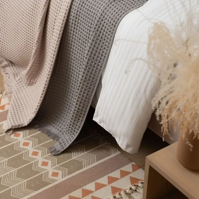 Покрывало Terrestre выполнено в современном стиле, но благодаря универсальному дизайну и палитре спокойных оттенков оно сможет дополнить почти любой интерьер. Его можно использовать для декора кровати, дивана и кресла, а также в качестве легкого одеяла в теплое время года.