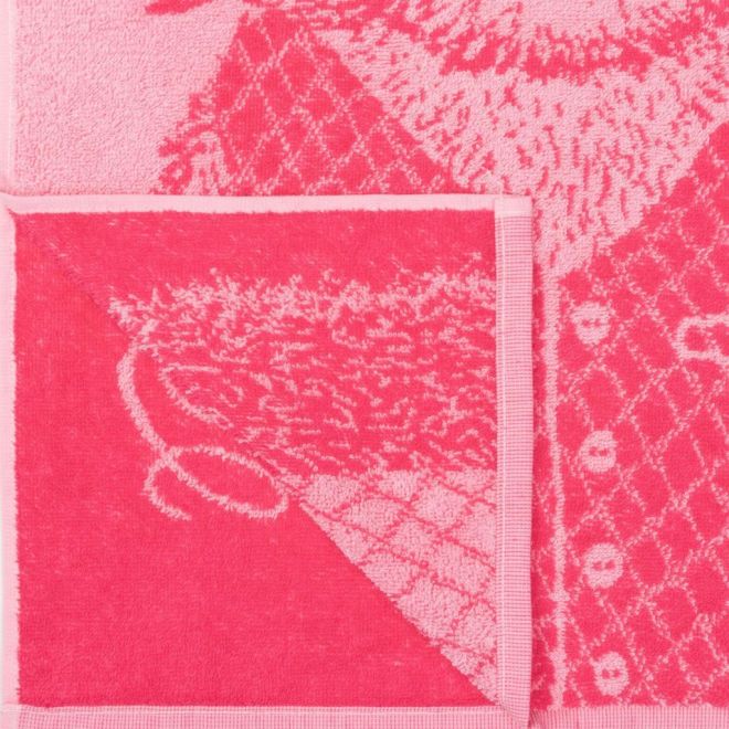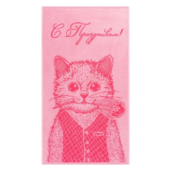 Махровое полотенце из 100% хлопка – прекрасный подарок представительницам прекрасного пола. Изделие выполнено в сочетании ярко-розового и нежно-розового оттенков и украшено изображением милого кота с букетом цветов и надписью «С праздником!» Полотенце не только привлекательное внешне, но и очень практичное. Благодаря пряже высокого качества это изделие средней плотности хорошо впитывает влагу и быстро сохнет, а также сохраняет цвет и форму даже после большого количества стирок. А специальная обработка махровых петель воздухом делает это полотенце особенно мягким и приятным на ощупь.