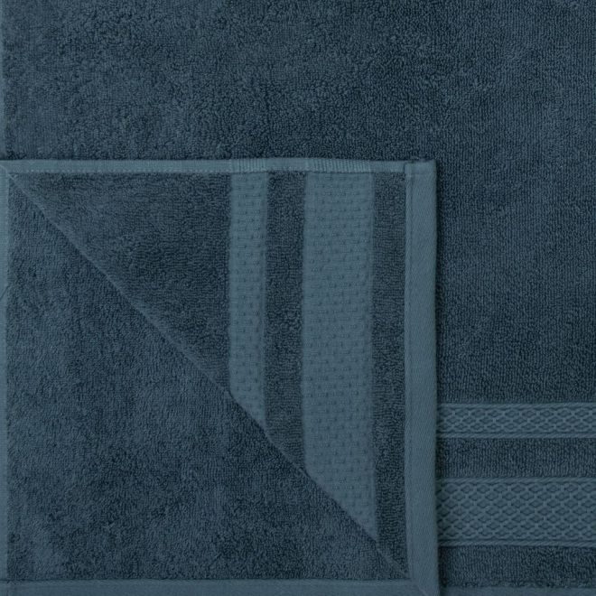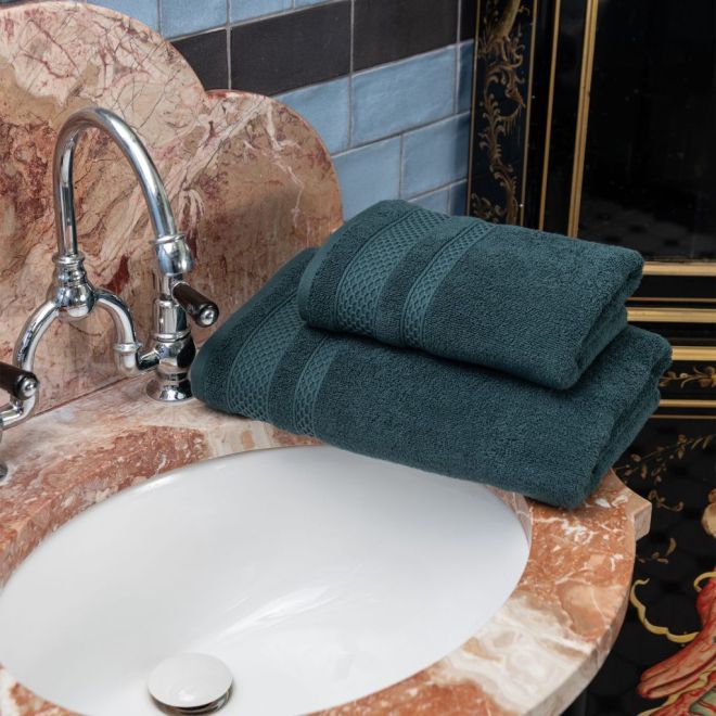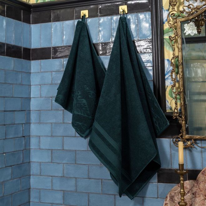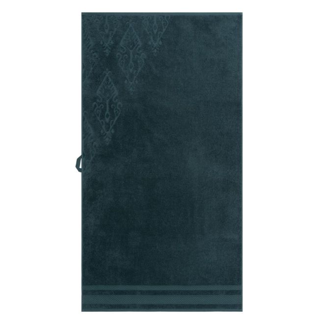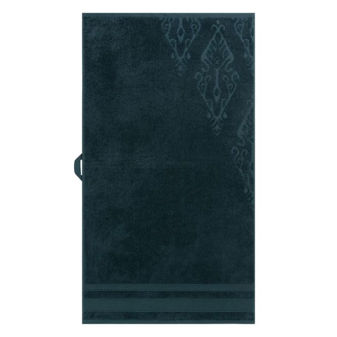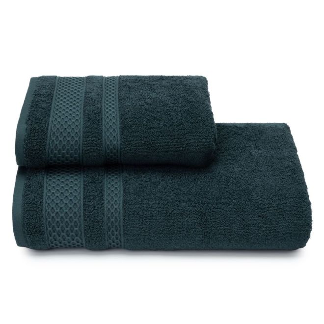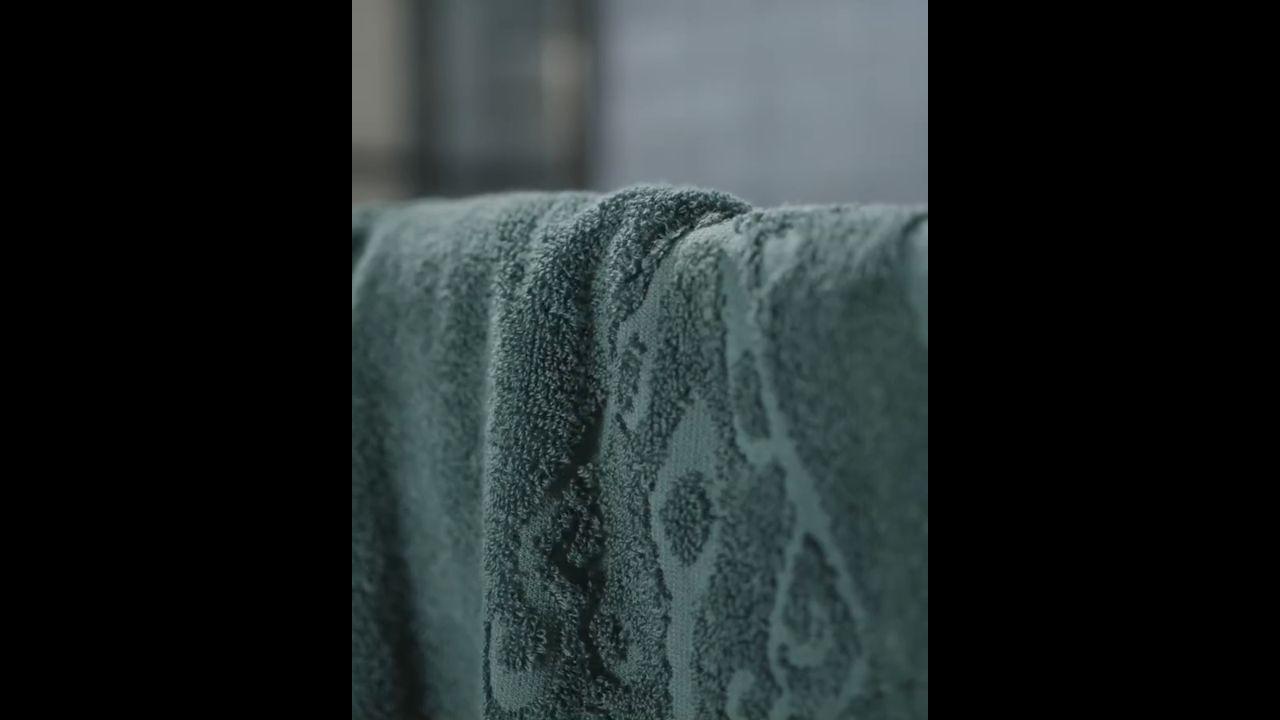 Изделие в оттенке морского мха украшено рельефными классическими вензелями в этническом стиле. «Двойной» бордюр полотенца декорирован эффектом плиссе и рельефным переплетением в виде ячеек – он выглядит дорого и фактурно.