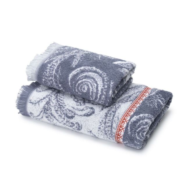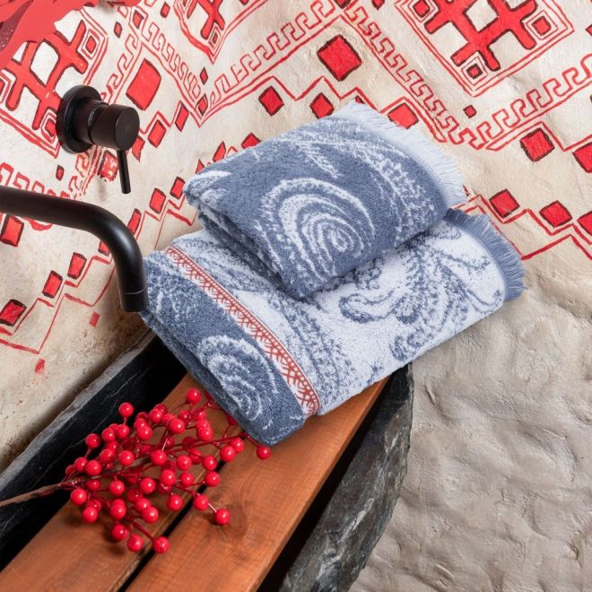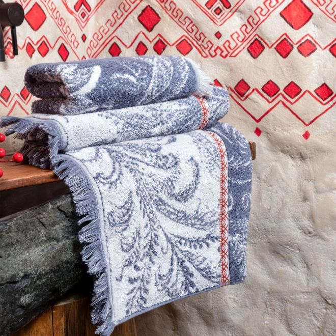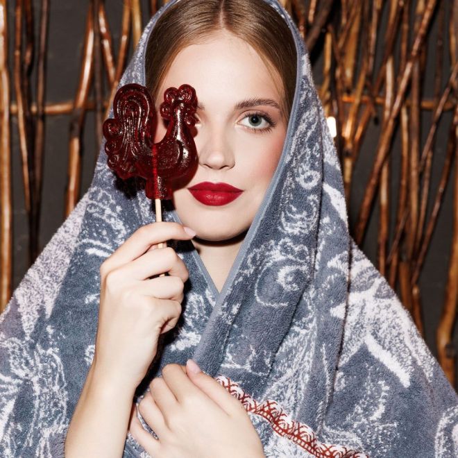 Полотенца кремневого серого оттенка украшены изображением Жар-птицы белого цвета, выполненным в стиле колоритной росписи – кудрины. Изделия дополнены контрастным бордюром цвета красной смородины в стиле традиционной вышивки крестиком и украшены уютной бахромой по краям.