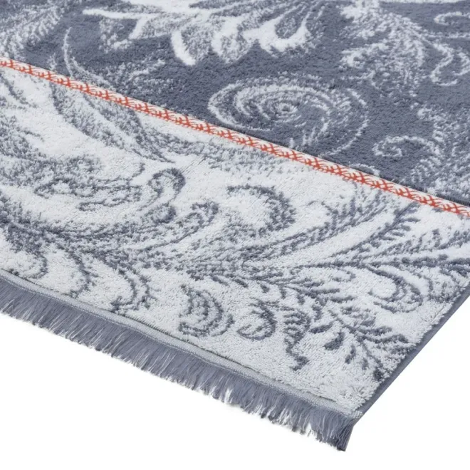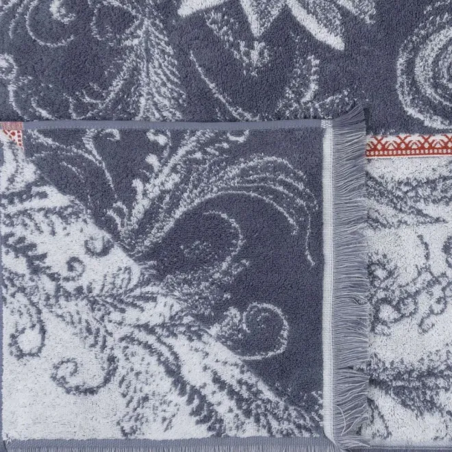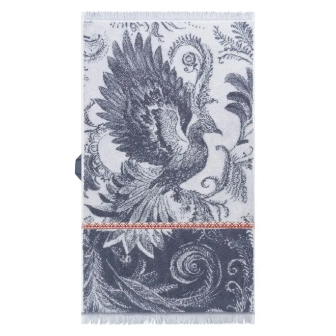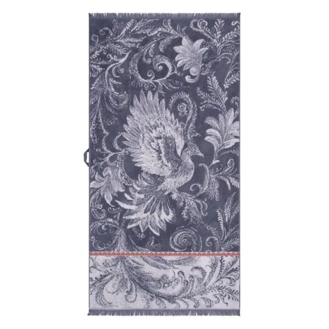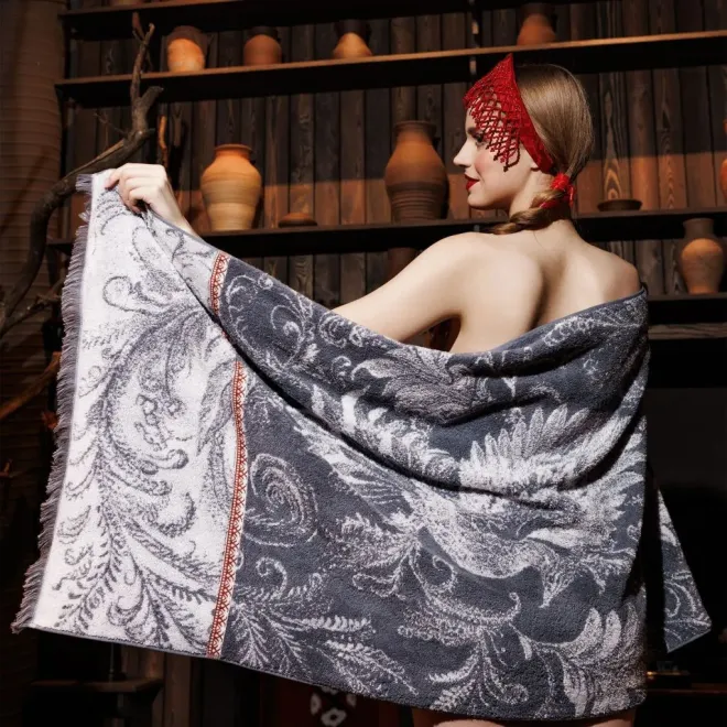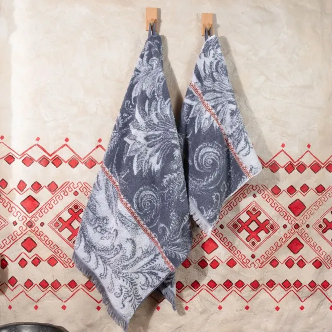 Полотенца кремневого серого оттенка украшены изображением Жар-птицы белого цвета, выполненным в стиле колоритной росписи – кудрины. Изделия дополнены контрастным бордюром цвета красной смородины в стиле традиционной вышивки крестиком и украшены уютной бахромой по краям.