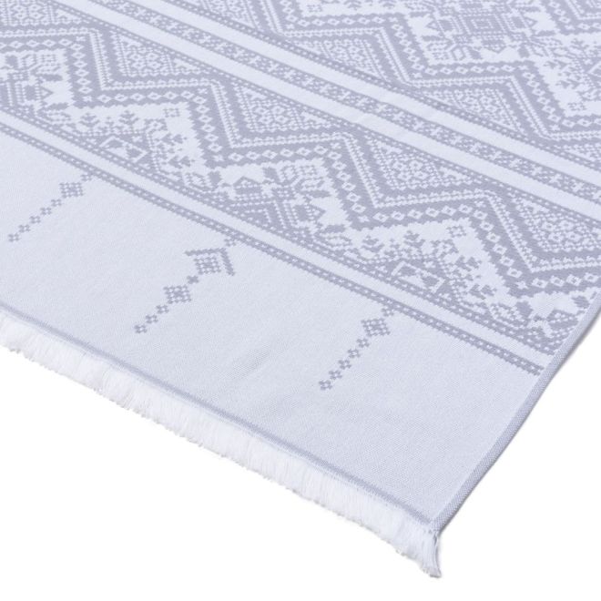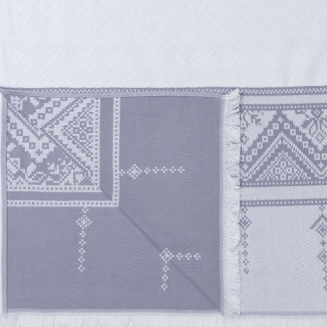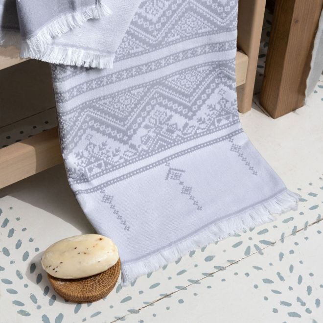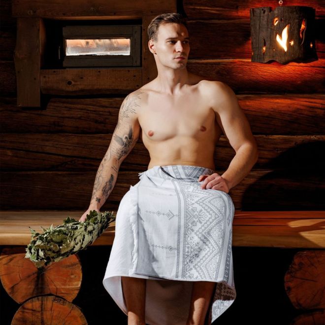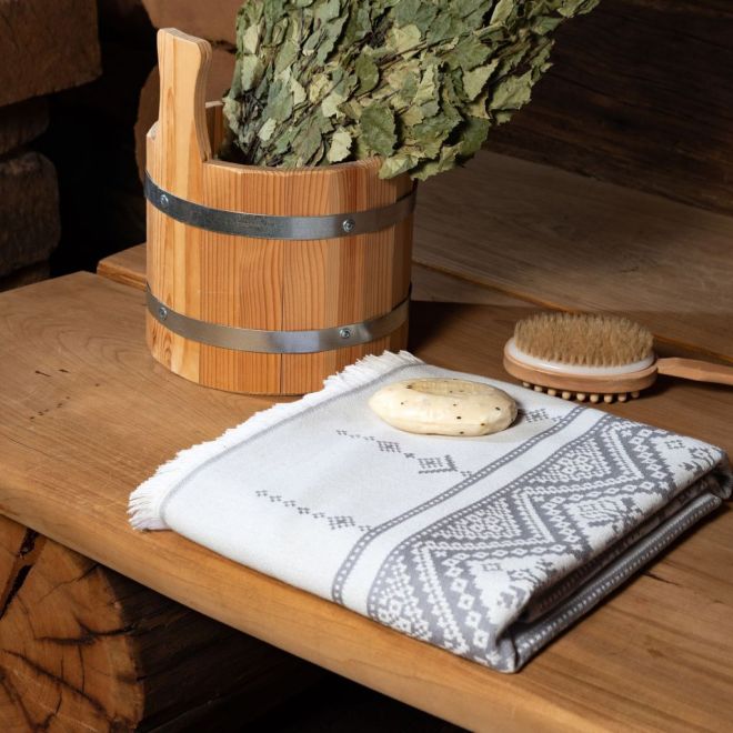 Полотенце для сауны и ванной «Скань» выполнено в белом цвете и украшено серебристым узором в виде минималистичного кружева. Такое жаккардовое полотенце, вдохновленное традиционными русскими ремеслами и украшенное уютной бахромой, станет украшением любой ванной, бани или сауны.