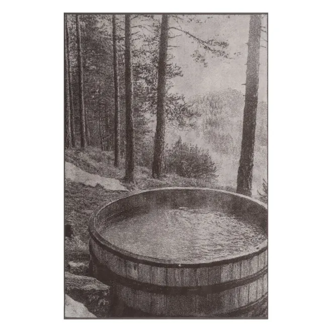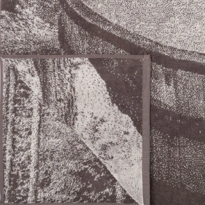 Пестротканое полотенце выполнено в экологичной цветовой гамме – сочетании мягкого бежевого и древесного оттенков. Центральный элемент дизайна —изображение деревянной купели с горячей водой посреди зимнего горного леса. Это отсылка к одному из любимых мужских хобби — русской бане.