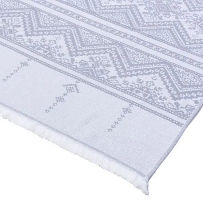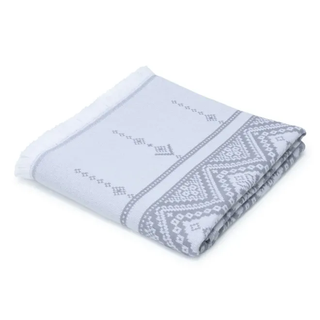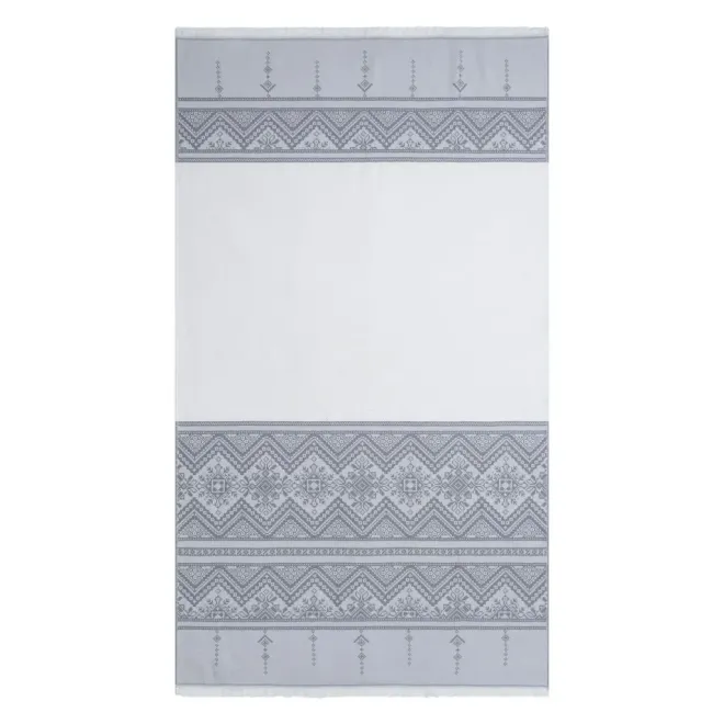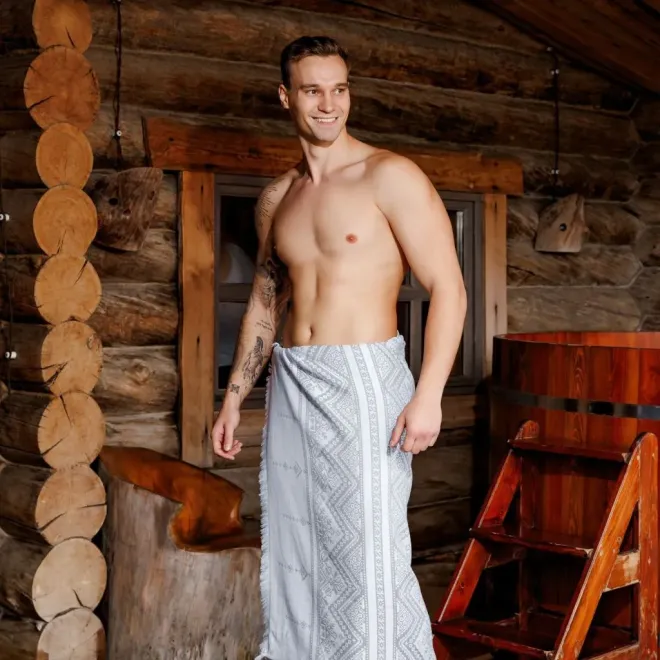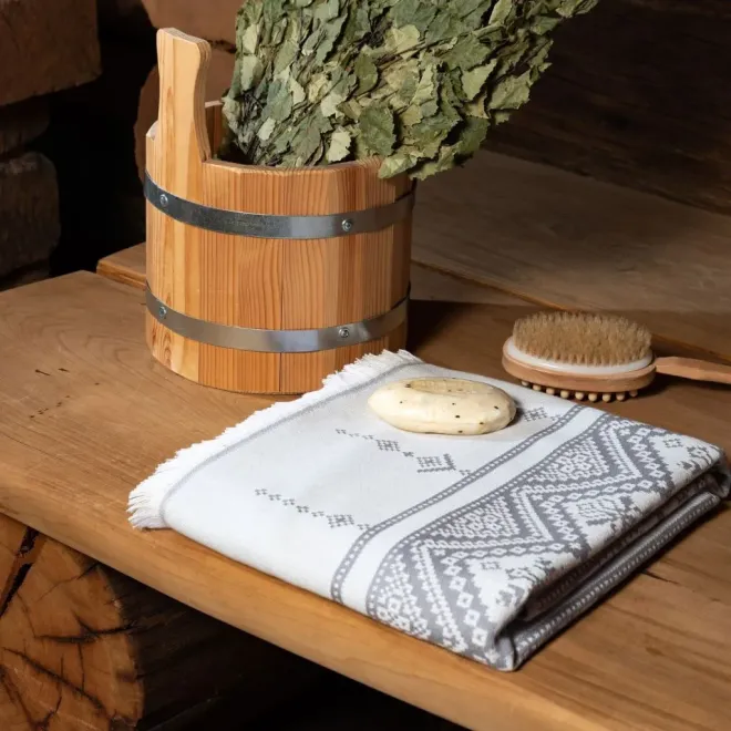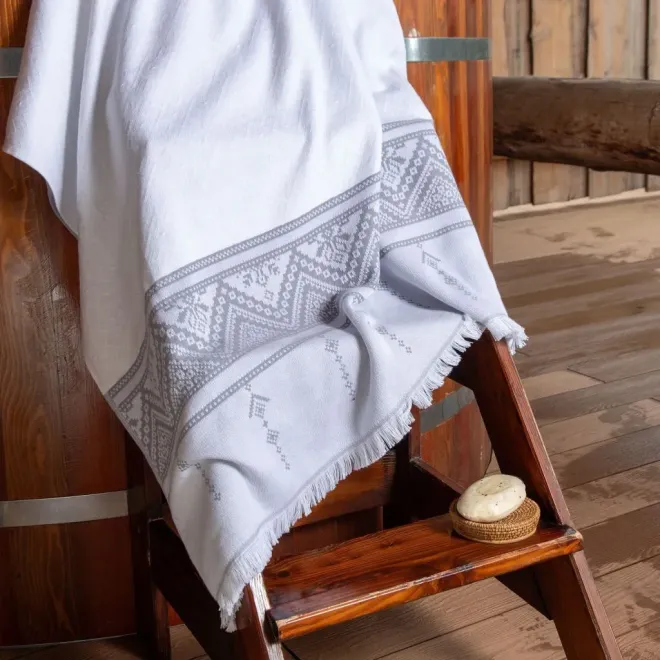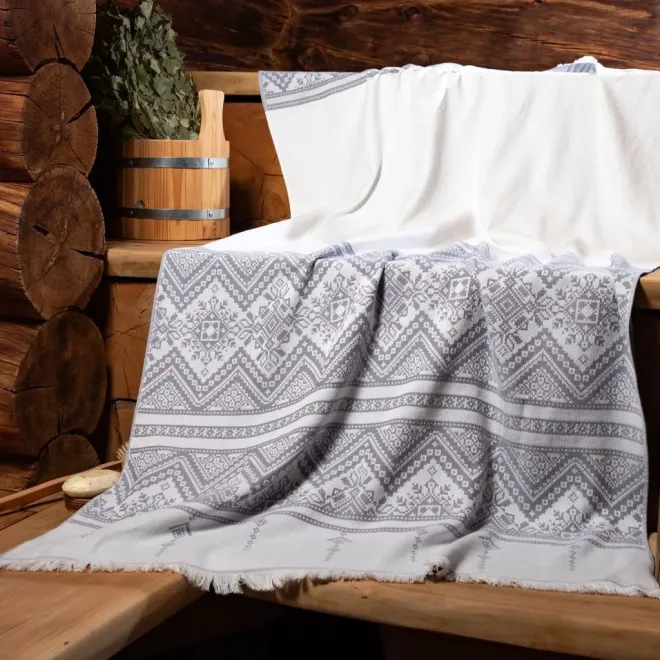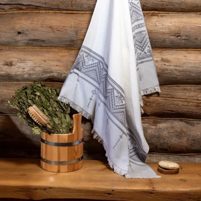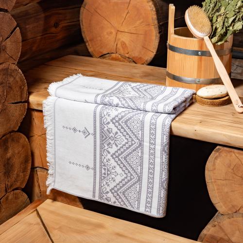 Полотенце для сауны и ванной «Скань» выполнено в белом цвете и украшено серебристым узором в виде минималистичного кружева. Такое жаккардовое полотенце, вдохновленное традиционными русскими ремеслами и украшенное уютной бахромой, станет украшением любой ванной, бани или сауны.