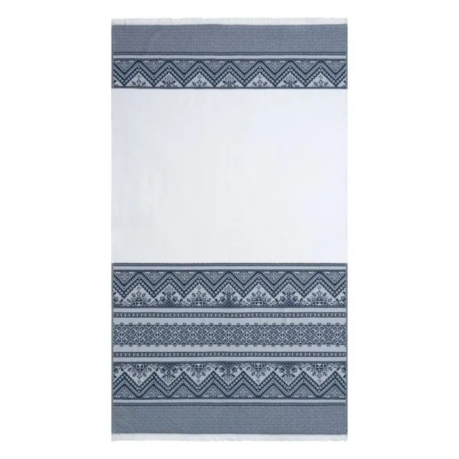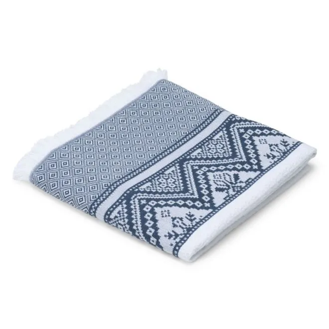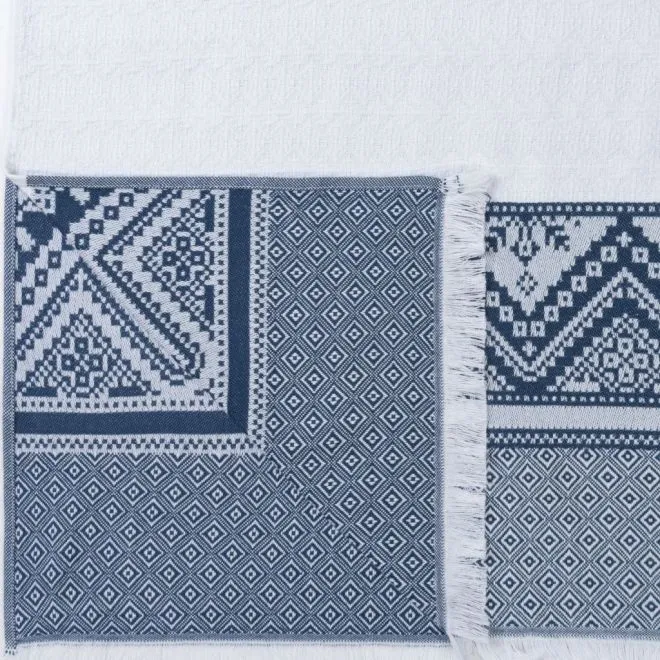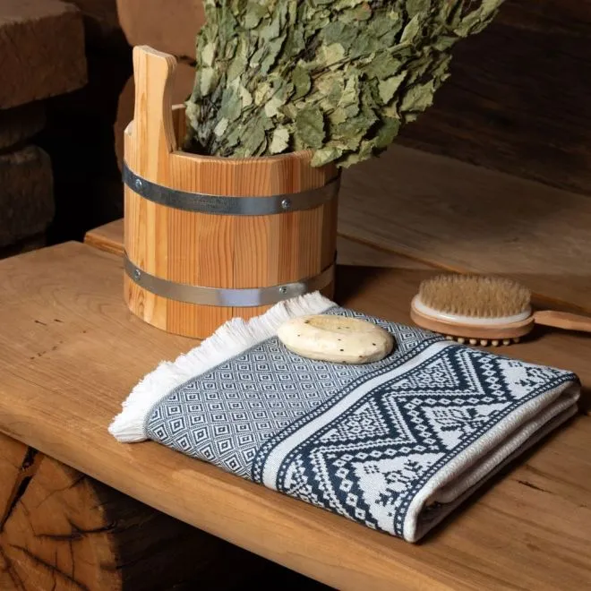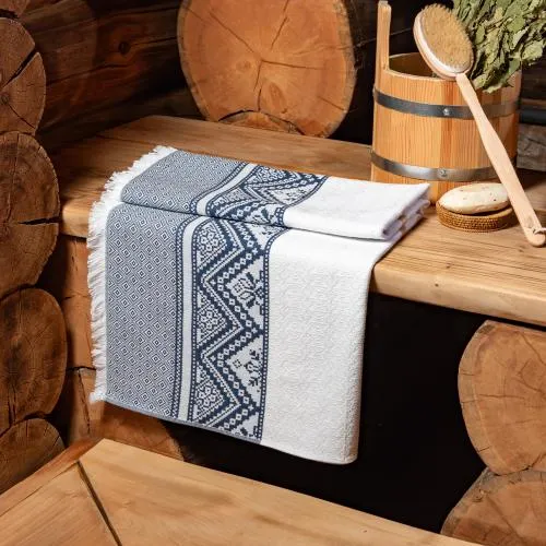 Полотенце для сауны и ванной «Узорчье» выполнено в чистом белом цвете и украшено насыщенно-синим узором в виде минималистичного кружева. Такое жаккардовое полотенце, вдохновленное традиционными русскими ремеслами и украшенное уютной бахромой, станет украшением любой ванной, бани или сауны.