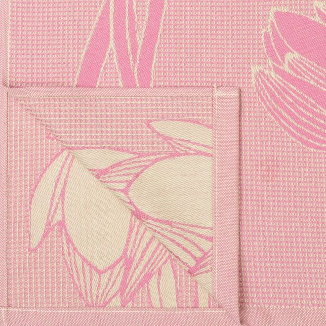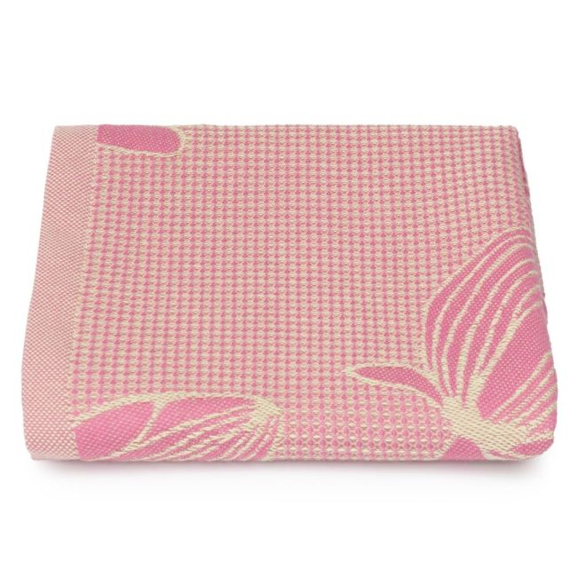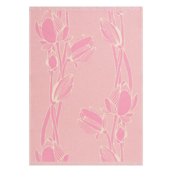 Вафельное полотенце выполнено в современном сочетании оттенков свежей зелени и ягодного шербета. Изделие украшено стилизованным изображением цветущих магнолий. Такой дизайн создает ощущение свежести, летнего настроения и средиземноморского уюта в интерьере.