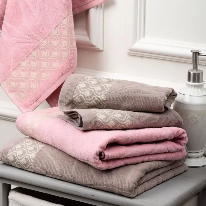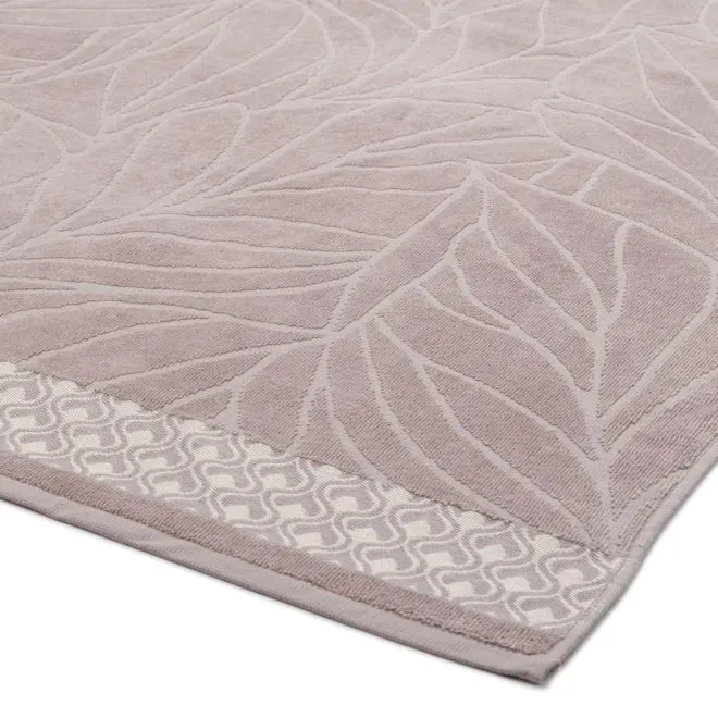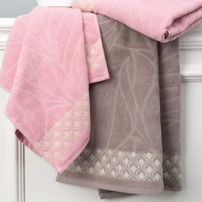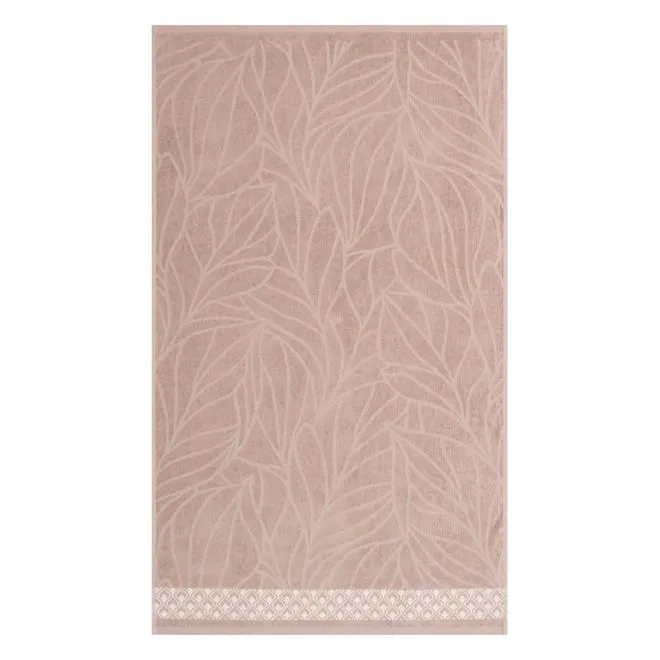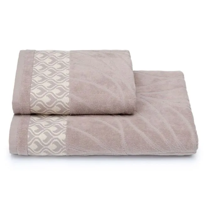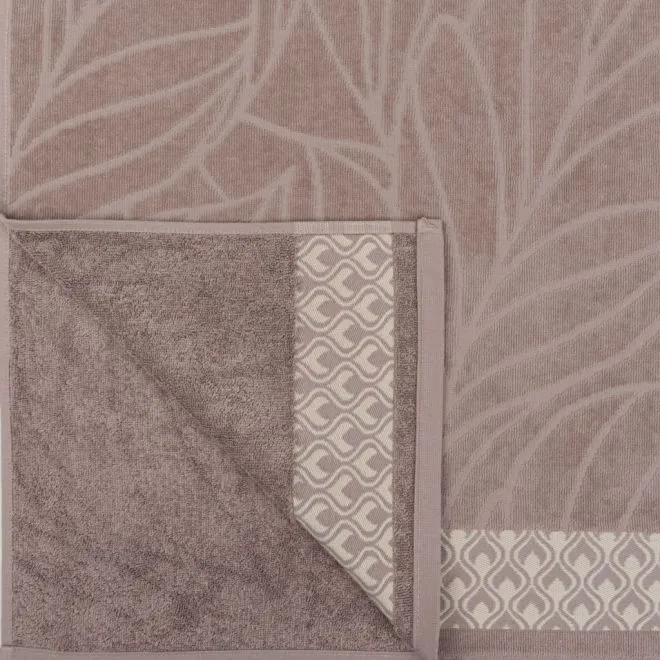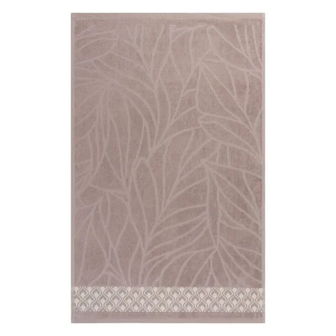 Полотенце выполнено в светлом серо-бежевом цвете. Полотно декорировано рельефным рисунком в виде листьев. Сюжет передан махровыми петлями и ткацким плетением, при котором ворс располагается на обратной стороне полотна. Изделие дополнено растительным орнаментом из светло-бежевой полиэфирной нити в бордюре. Полотно средней плотности хорошо впитывает влагу и быстро сохнет. Изделие долго остается мягким и пушистым, сохраняет насыщенность цвета и форму даже после многократных стирок. Нежные петли полотенца деликатно ухаживают за кожей, улучшая ее тургор.