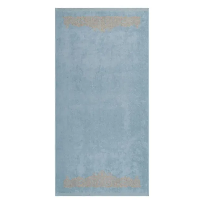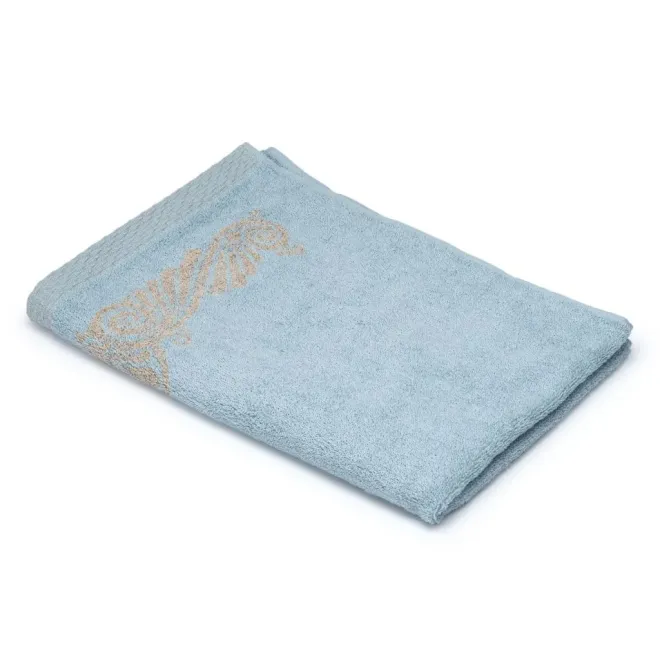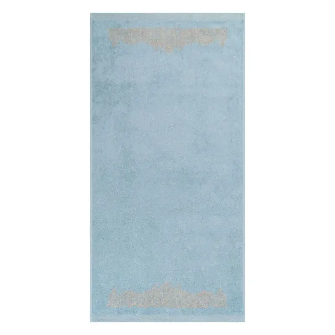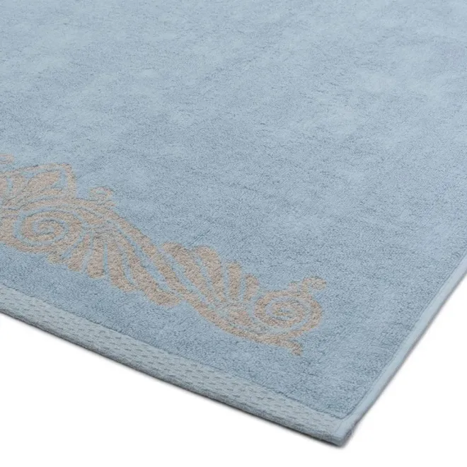 Нежное махровое полотенце голубого цвета украшено в бордюрах контрастным греческим орнаментом. Полотно выполнено с использованием смесовой пряжи: с одной стороны изделие полностью хлопковое, а с другой стороны – льняное. Благодаря такому составу полотенце обладает легким массажным эффектом. Льняное полотенце повышенной плотности наделено высокой гигроскопичностью и воздухопроницаемостью – активно впитывает влагу и быстро сохнет.