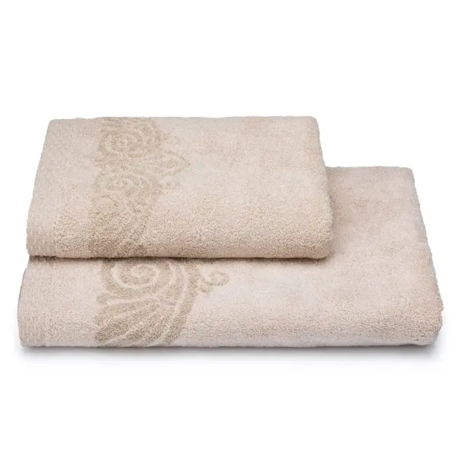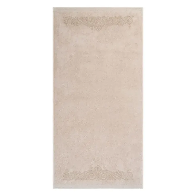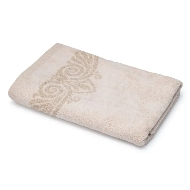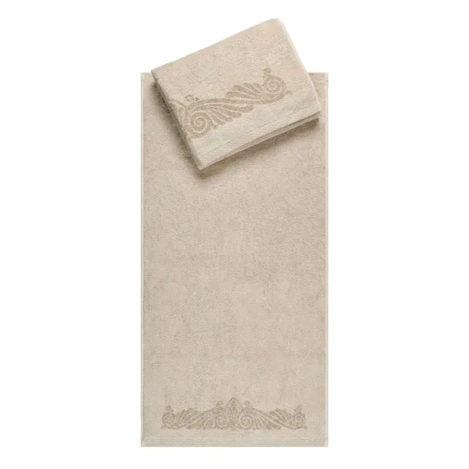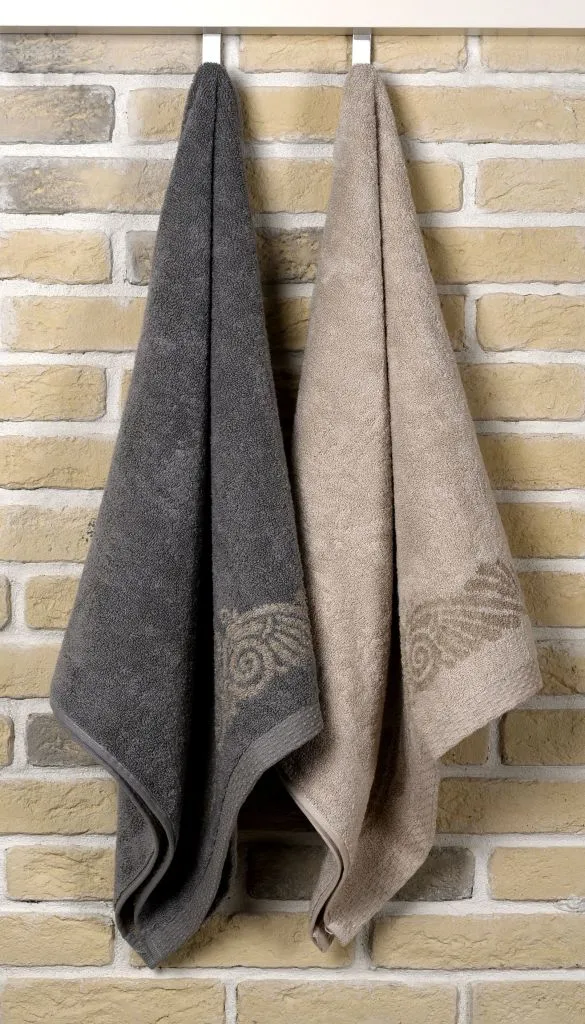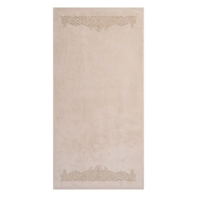 Нежное махровое полотенце бежевого цвета украшено в бордюрах контрастным греческим орнаментом. Полотно выполнено с использованием смесовой пряжи: с одной стороны изделие полностью хлопковое, а с другой стороны – льняное. Благодаря такому составу полотенце обладает легким массажным эффектом. Льняное полотенце повышенной плотности наделено высокой гигроскопичностью и воздухопроницаемостью – активно впитывает влагу и быстро сохнет.