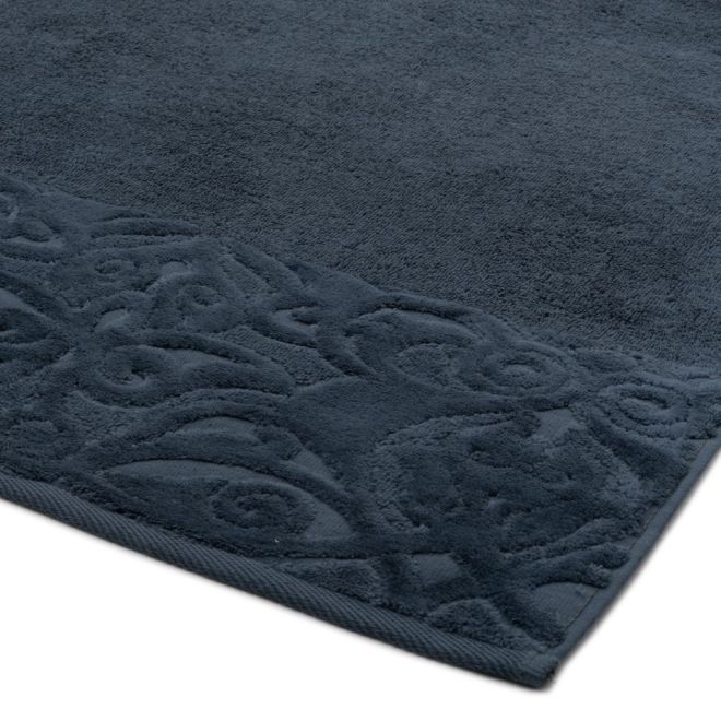 Махровое полотенце для лица выполнено из 100%-ного хлопка. Мягкое изделие базальтового серо-синего цвета декорировано в бордюре растительным узором из стриженых петель. Пушистое полотенце размером 50х90 см и плотностью 460 г/м2 хорошо впитывает влагу, быстро сохнет.