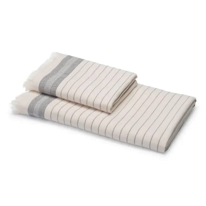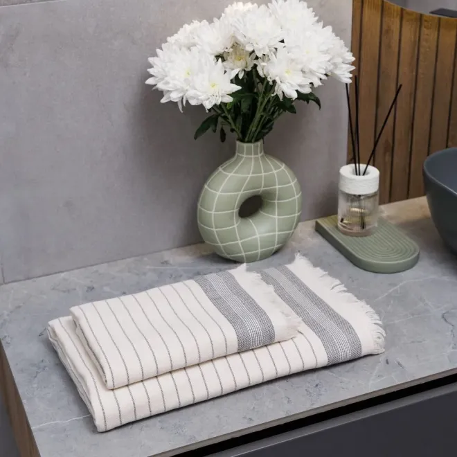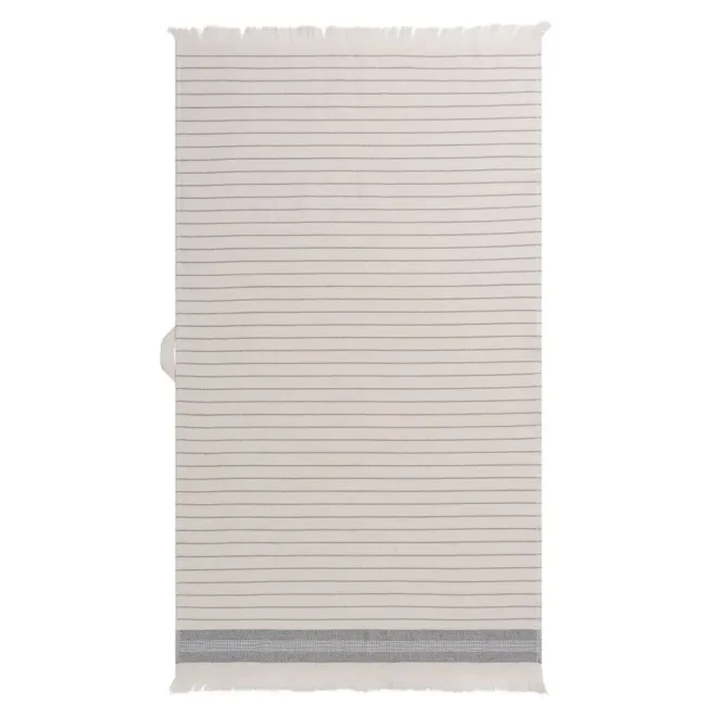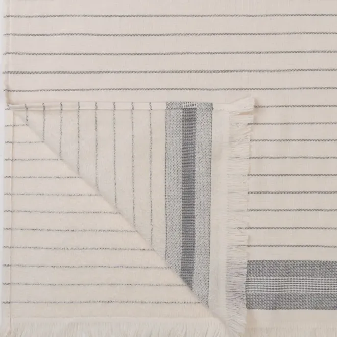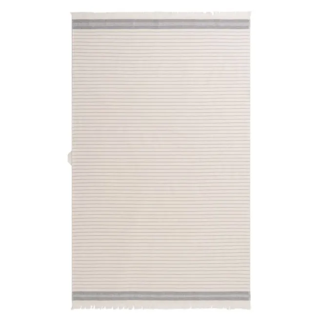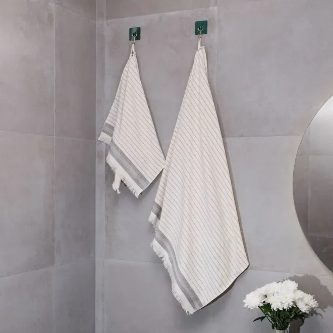 Изделие молочно-кремового оттенка декорировано контрастными полосками, выполненными полиэфирной нитью темно-серого цвета, рельефным бордюром и уютной бахромой. Изделие имеет удобный размер, и при этом оно очень легкое благодаря тому, что махровая поверхность у него только с одной стороны. Полотенце имеет петельку из репсовой ленты для удобного хранения в ванной.