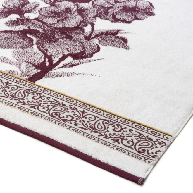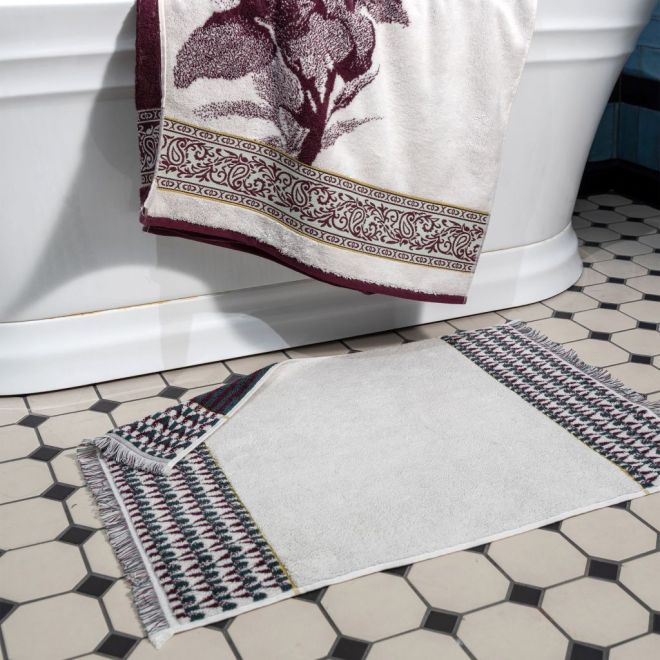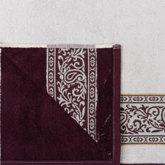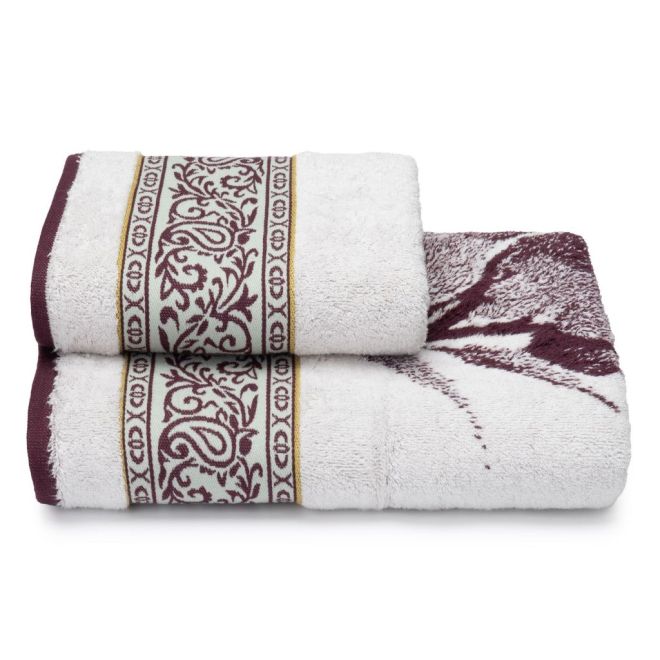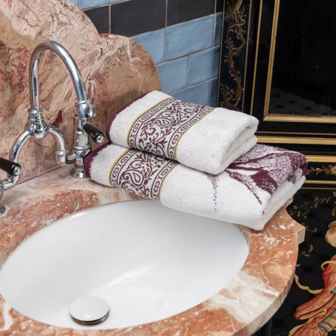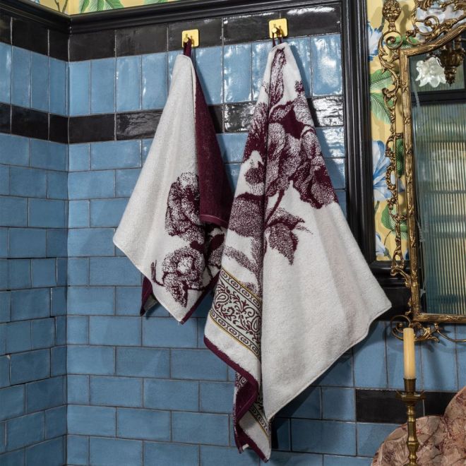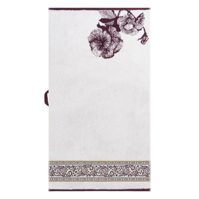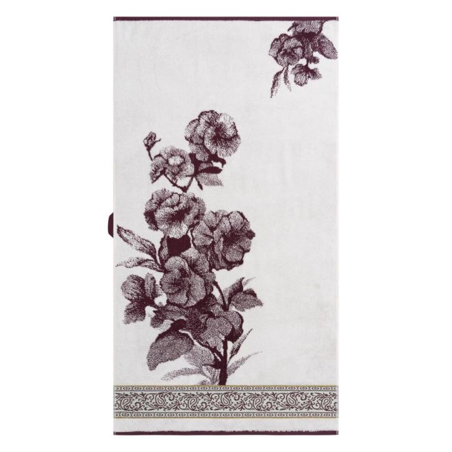 Эффектное полотенце украшено изображением цветущих петуний в винтажном стиле и выполнено в сочетании оттенков сливового вина и ванили. Привлекающий внимание бордюр декорирован геометрическим орнаментом и узором «пейсли» с включением золотисто-зеленого и пастельного зеленого оттенков. Особенно эффектно будет смотреться в ванной комнате дуэт полотенец разного размера – с разной композицией одного флористического узора.