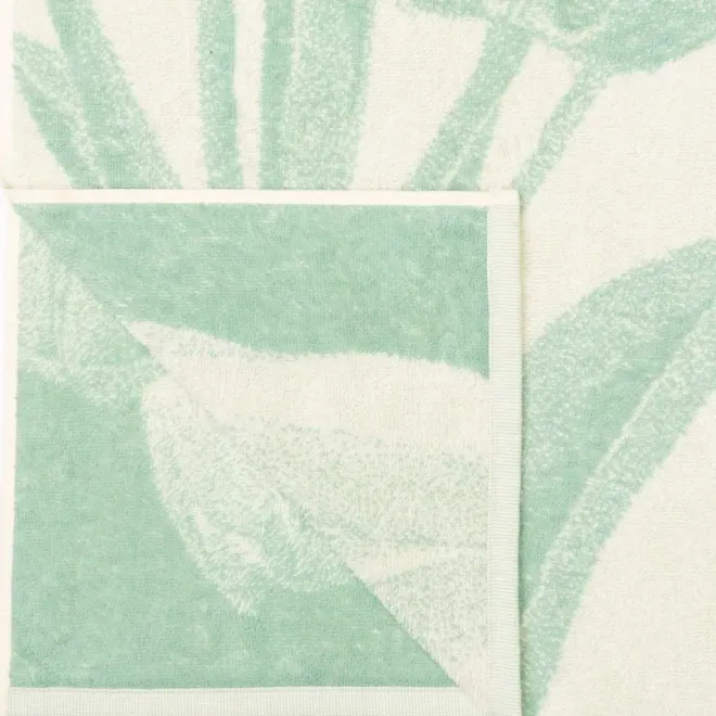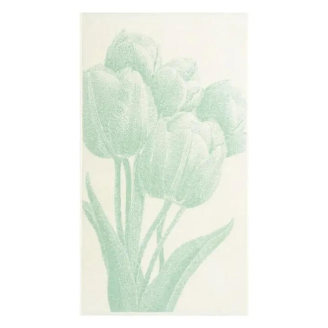 Пестротканое полотенце выполнено в ванильном цвете и украшено букетом изящных тюльпанов бирюзового оттенка. Такой дизайн создает романтичное и праздничное настроение.