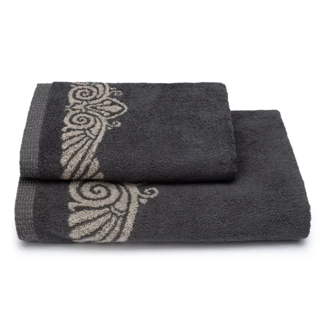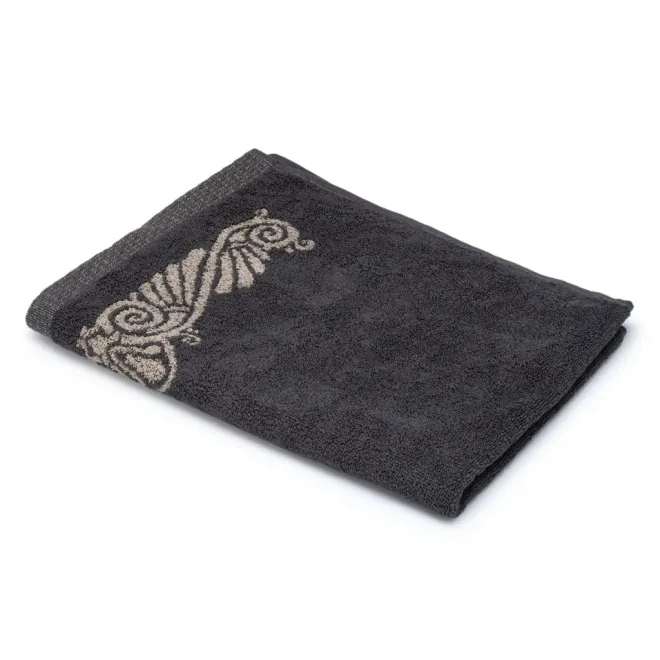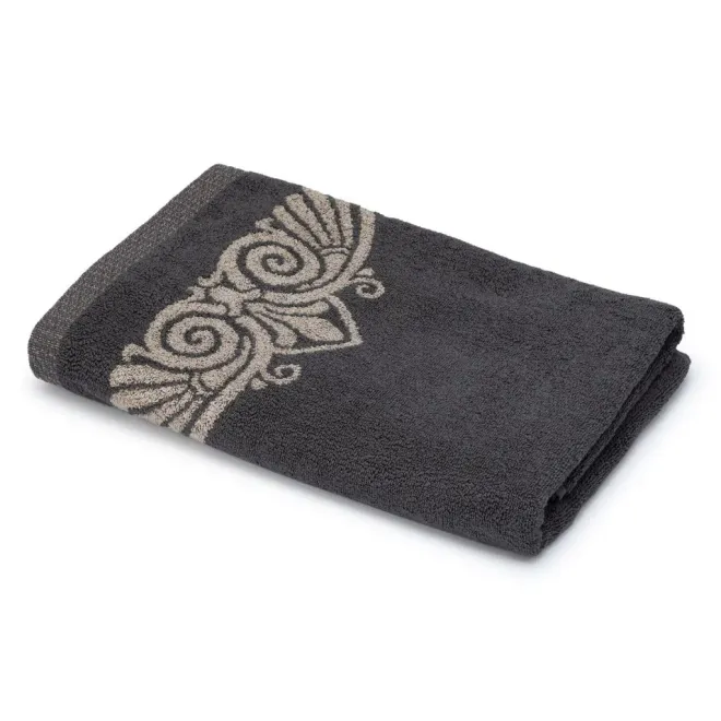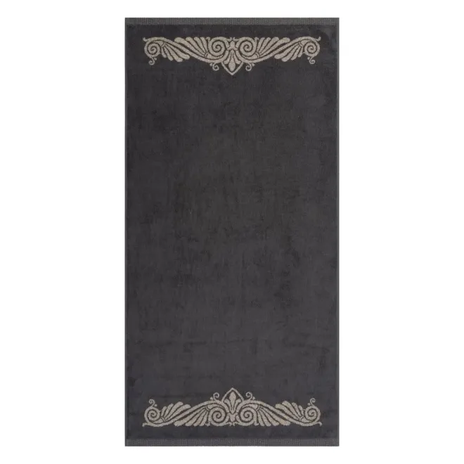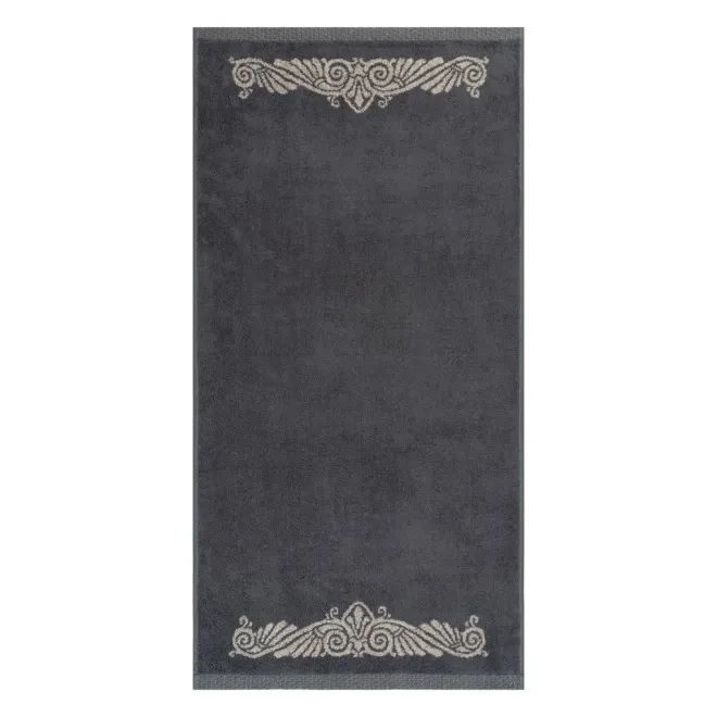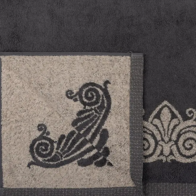 Нежное махровое полотенце темно-серого цвета украшено в бордюрах контрастным греческим орнаментом. Полотно выполнено с использованием смесовой пряжи: с одной стороны изделие полностью хлопковое, а с другой стороны – льняное. Благодаря такому составу полотенце обладает легким массажным эффектом. Льняное полотенце повышенной плотности наделено высокой гигроскопичностью и воздухопроницаемостью – активно впитывает влагу и быстро сохнет.