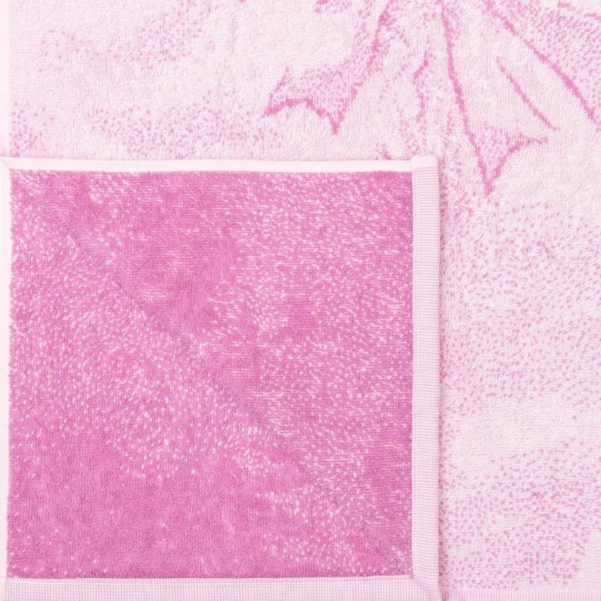 Пестротканое полотенце выполнено в сочетании нежно-розового и лилового оттенка. Изделие украшено букетом из воздушных шариков в форме сердечек, парящих среди облаков. Такой дизайн создает романтичное и праздничное настроение.