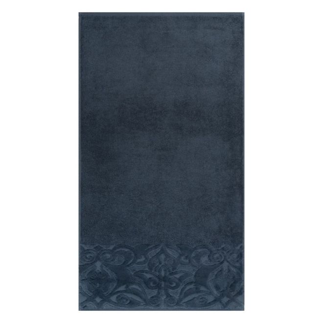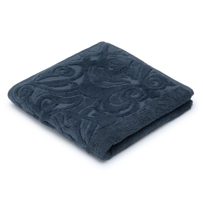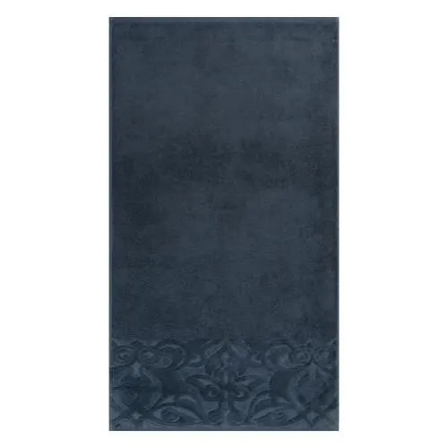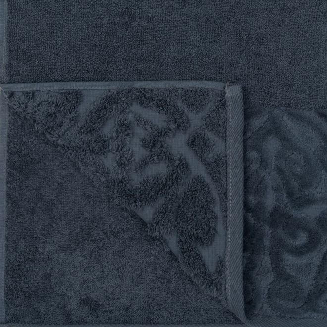 Махровое полотенце для лица выполнено из 100%-ного хлопка. Мягкое изделие базальтового серо-синего цвета декорировано в бордюре растительным узором из стриженых петель. Пушистое полотенце размером 50х90 см и плотностью 460 г/м2 хорошо впитывает влагу, быстро сохнет.