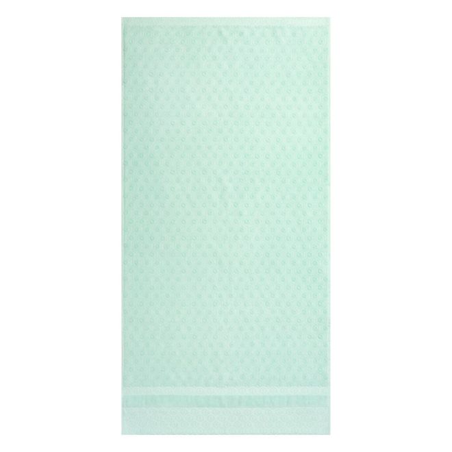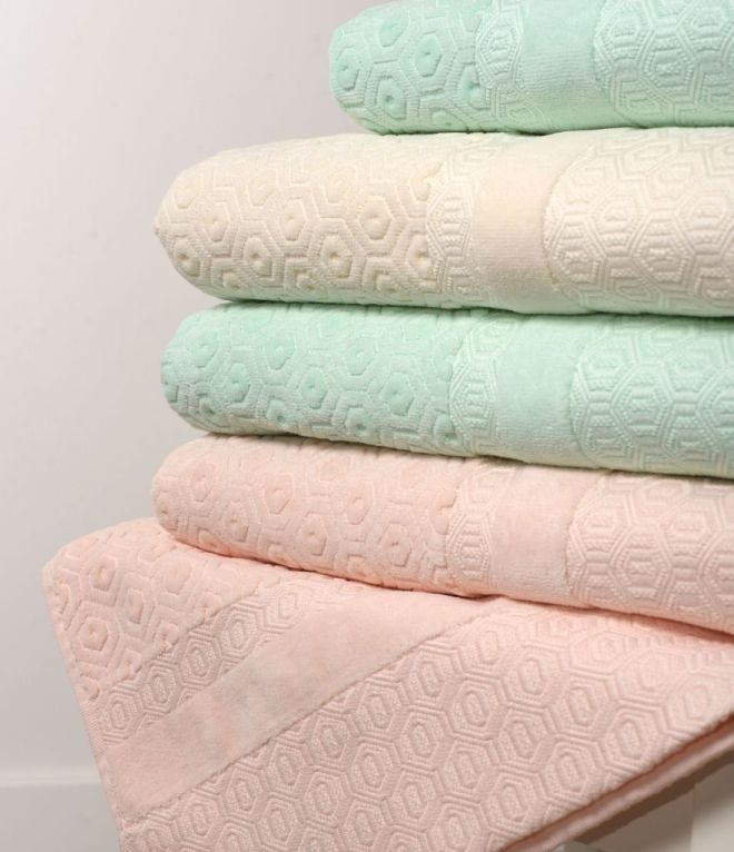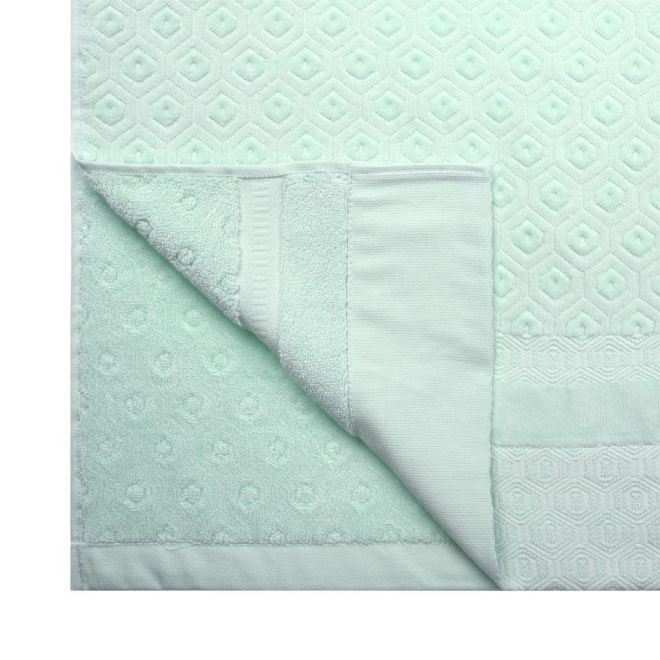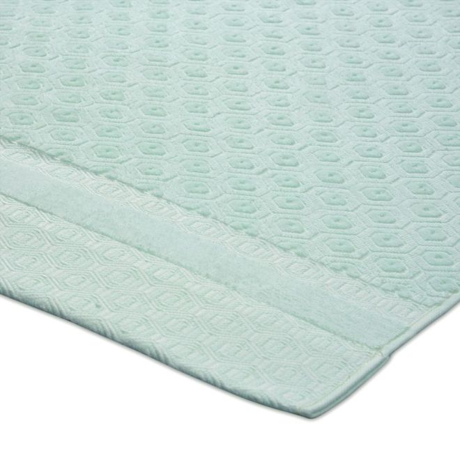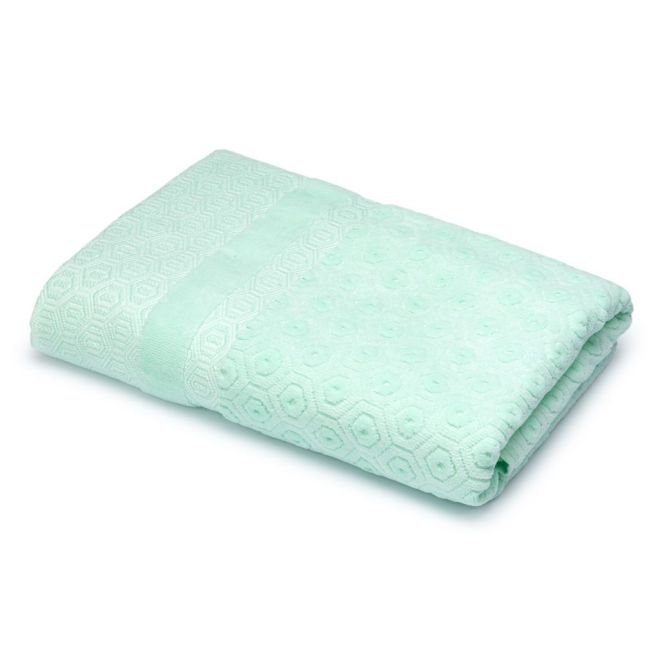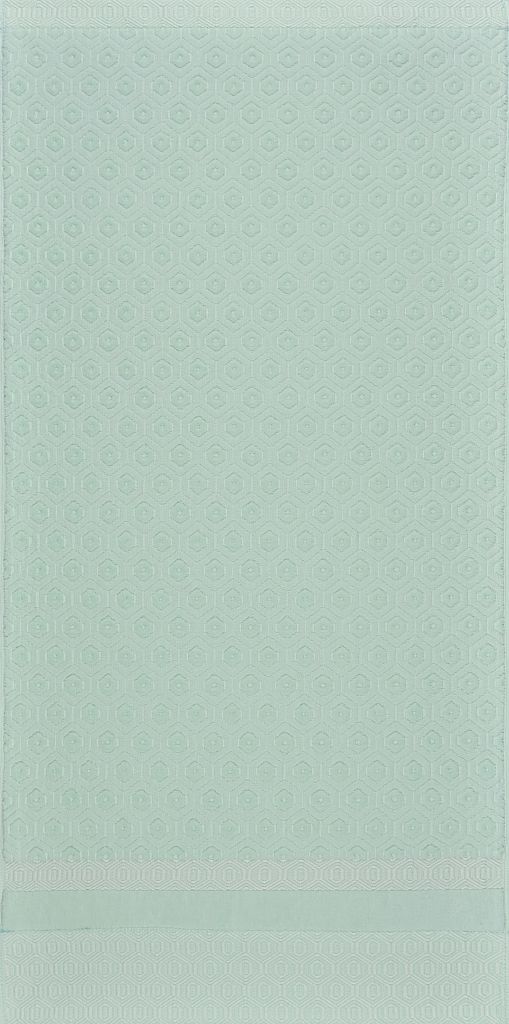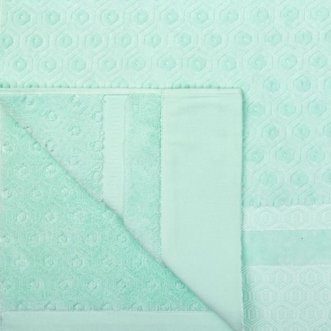 Махровое полотенце пастельно-зеленого цвета выполнено из 100%-ного хлопка. Изделие высокой плотности из премиальной пряжи обладает особой мягкостью. Полотно из стриженых петель с эффектом велюра декорировано рельефным геометрическим узором в виде сот.