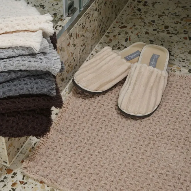 Благодаря однотонному дизайну, аккуратной эстетичной бахроме и универсальному бежевому оттенку коврик гармонично впишется в любой интерьер. Его можно использовать для оформления ванной комнаты, спальни, гостиной и балкона.
