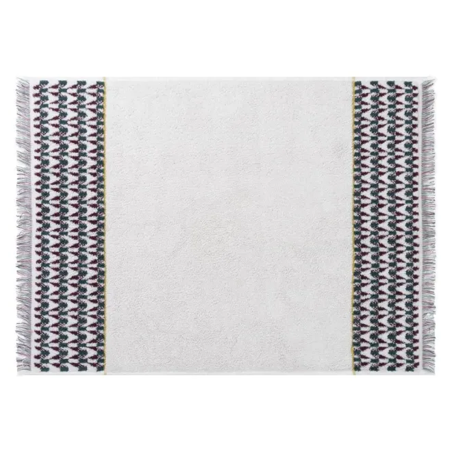 * Объем этим рисункам придает эффект разработки – чередование петель двух основных цветов, которое создает эффект третьего оттенка. К числу эффектных декоративных элементов относятся косичка золотисто-зеленого цвета в отделке и бахрома по краям, которая делает коврик еще более уютным.