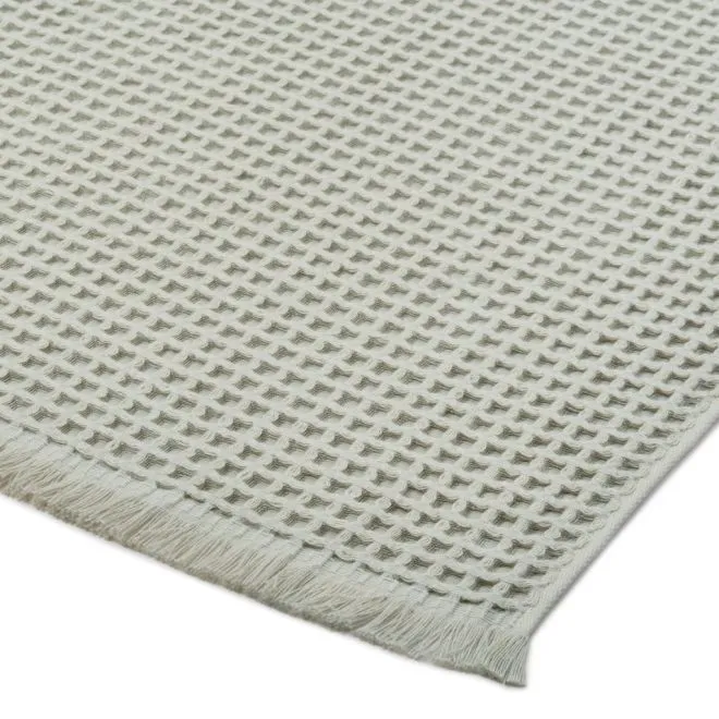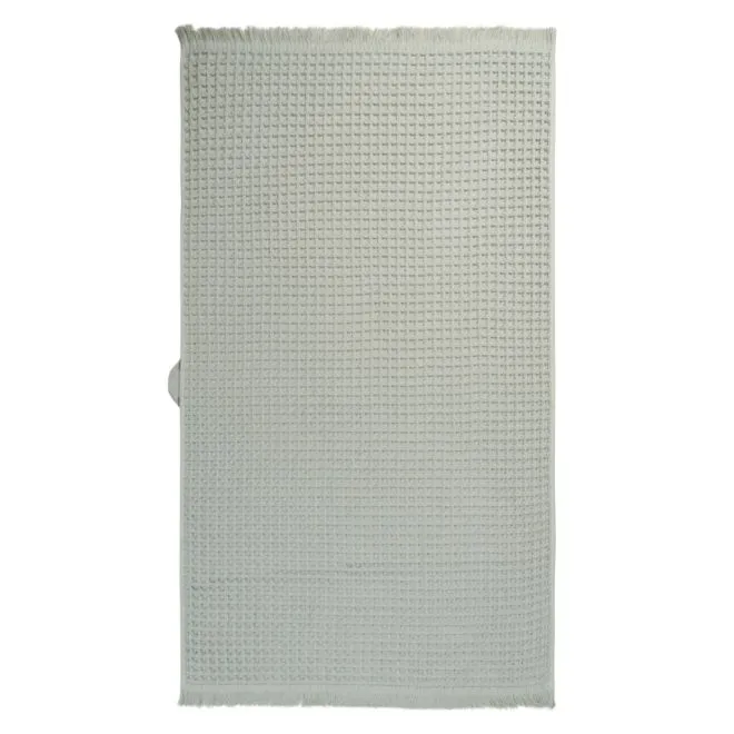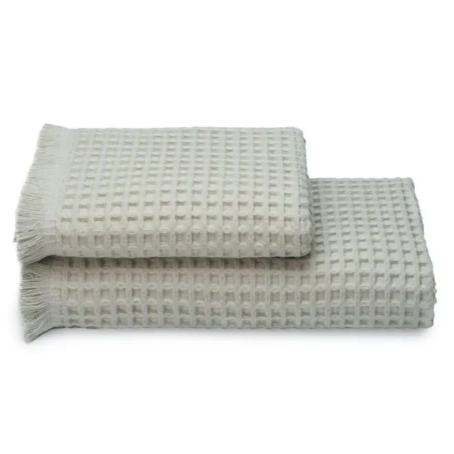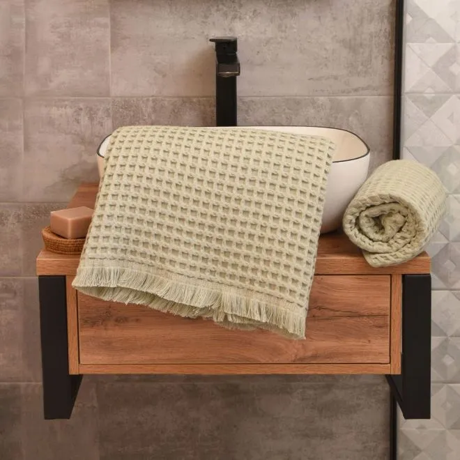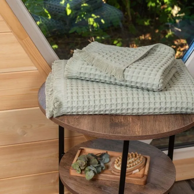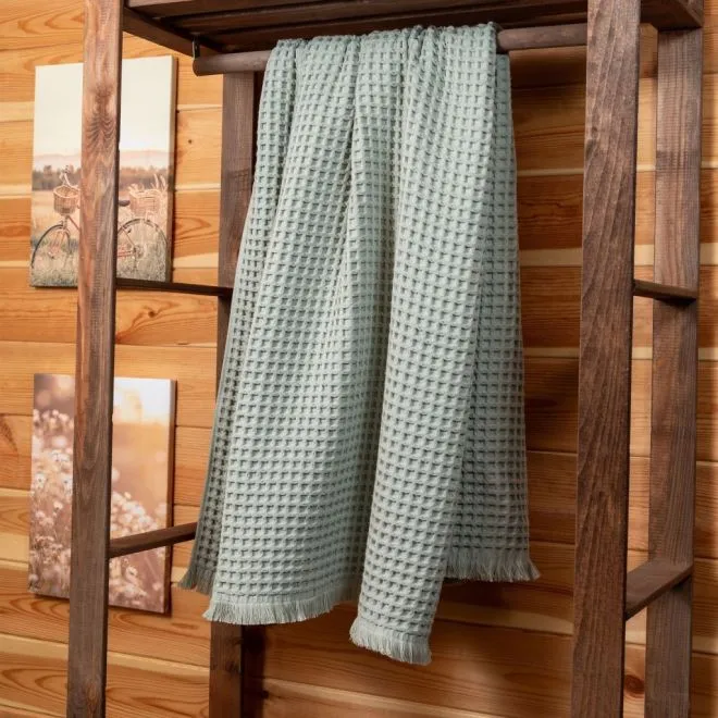 Полотенце выполнено в эко-стиле и окрашено в мягкий природный оттенок серебристой хвои. Бахрома, украшающая изделие, делает его еще более уютным и тактильно приятным.