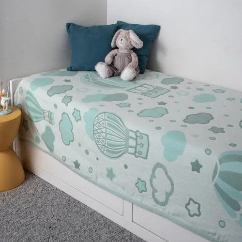 Детский плед выполнен в нежно молочно-зеленой гамме (молочный + мятный + ментоловый) и украшен изображениями воздушных шаров, облаков и звезд. Такой воздушный и легкий дизайн понравится всем детям – от новорожденных до младших школьников – и подарит им ощущение заботы, уюта и тепла!