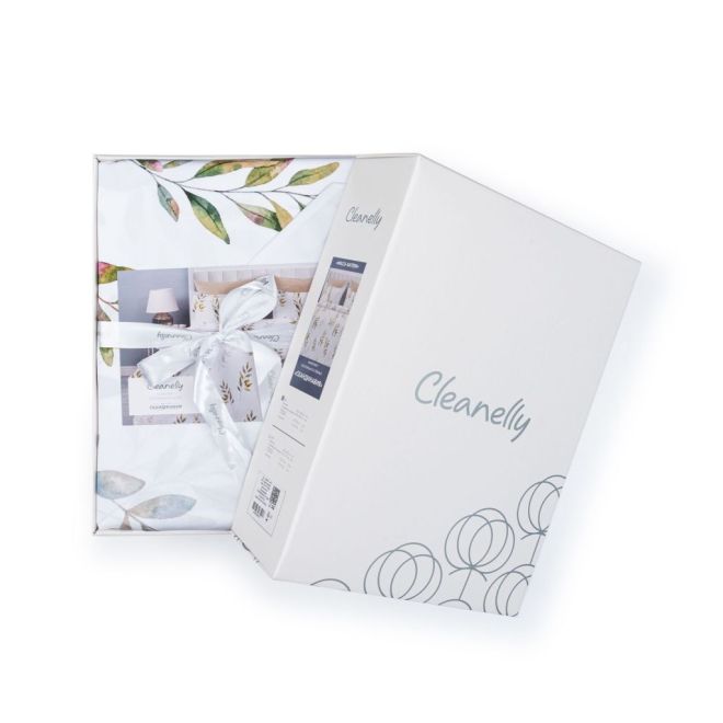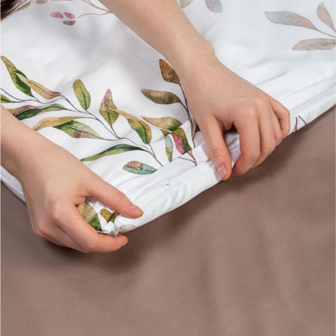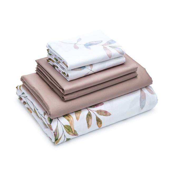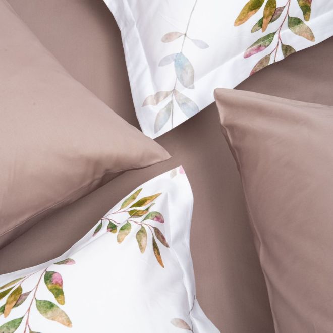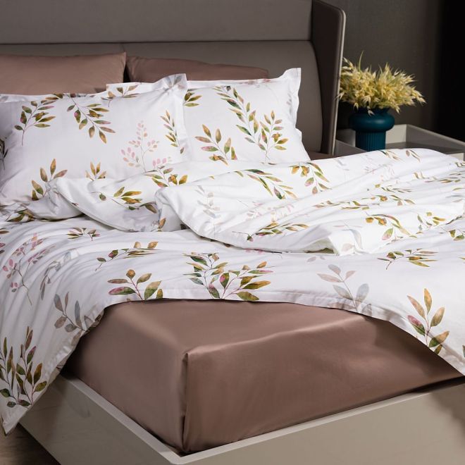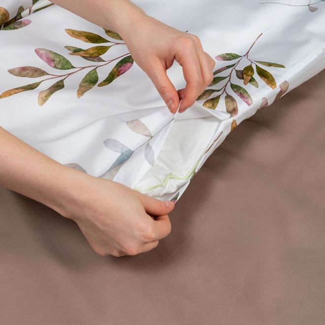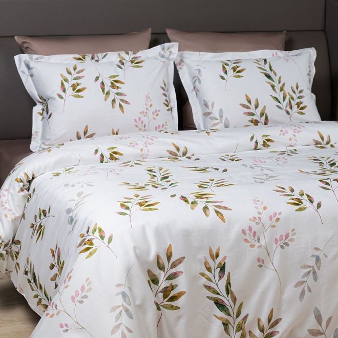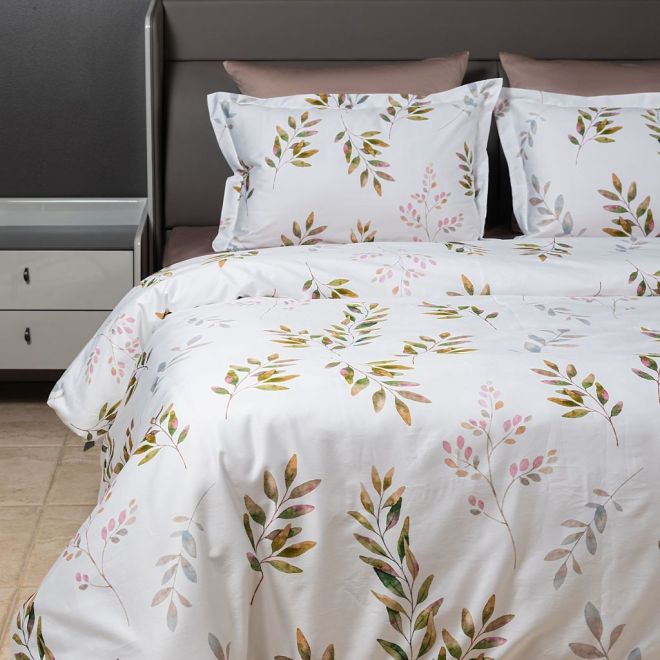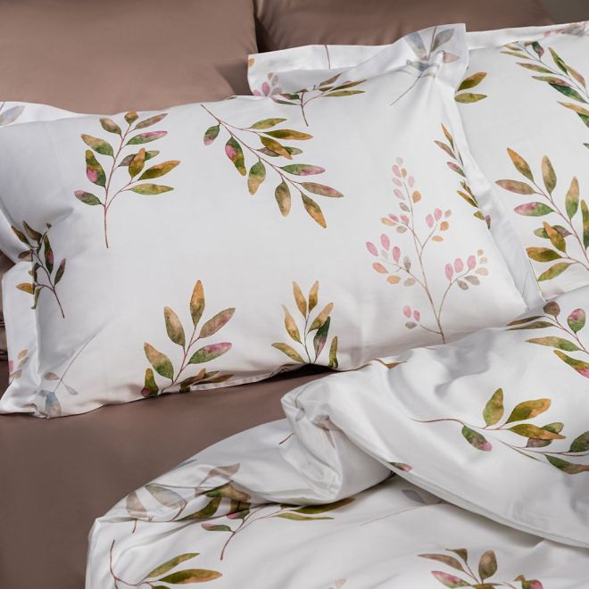 Постельное белье «Скандинавия» окрашено в мягкие оттенки природы, характерные для эко- стиля – на белоснежном фоне солируют оттенки зелени с вкраплениями серого, лилового и нежно-розового. Входящие в комплект пододеяльник и одна из наволочек украшены изображениями листьев – этот природный мотив является центральным в эко-стиле. Вторая наволочка и простыня выполнены из однотонной ткани-компаньона миндального оттенка. Все наволочки имеют застежки-клапаны, а наволочки в размере 50х70 сантиметров дополнены декоративными бортиками-ушками.