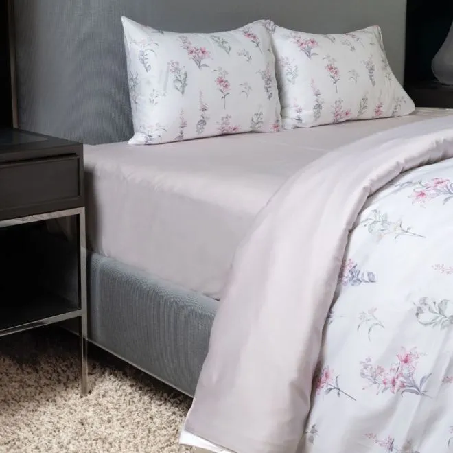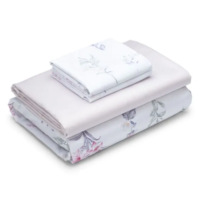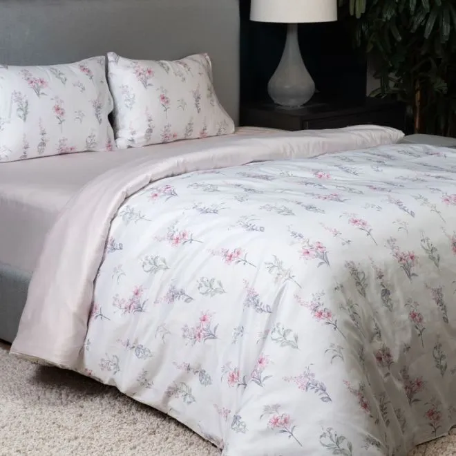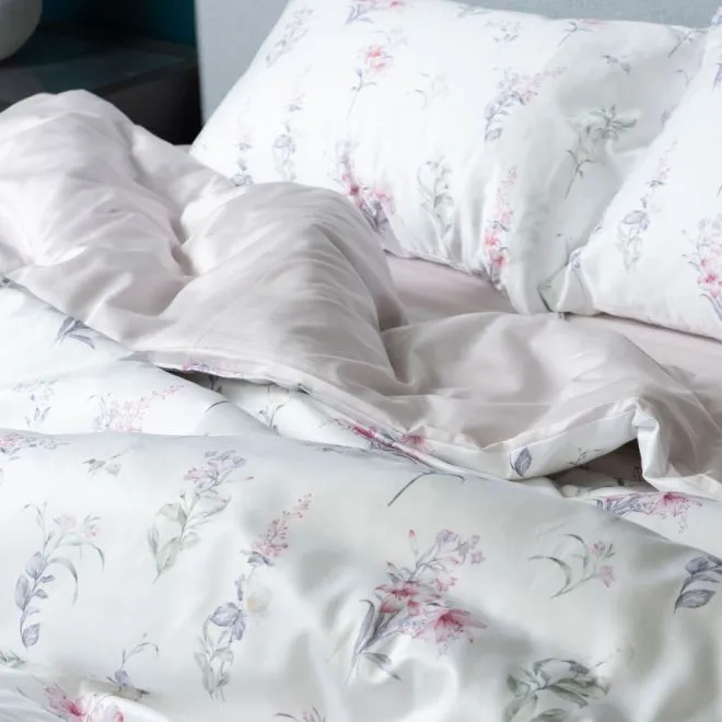 Постельное белье «Рустик» окрашено в мягкие оттенки природы, характерные для эко-стиля. В качестве основы выступает белый цвет, на фоне которого изображены миниатюрные букеты цветов. Нежные розовые лилии с сиреневыми листьями, белые вьюнки и плетистая роза выполнены в акварельной технике. Такой милый, слегка наивный дизайн рождает ощущение ностальгии о простых радостях жизни, навевает покой и романтичное настроение.