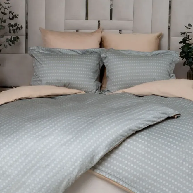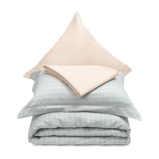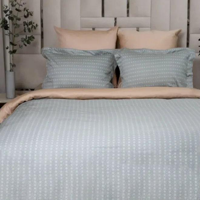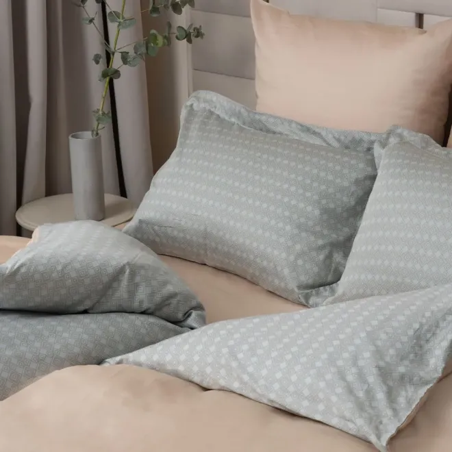 Две наволочки, простыня и изнаночная сторона пододеяльника выполнены в бежевом оттенке, а другие две наволочки и лицевая сторона пододеяльника, украшенные рисунком, объединяют в себе три цвета.