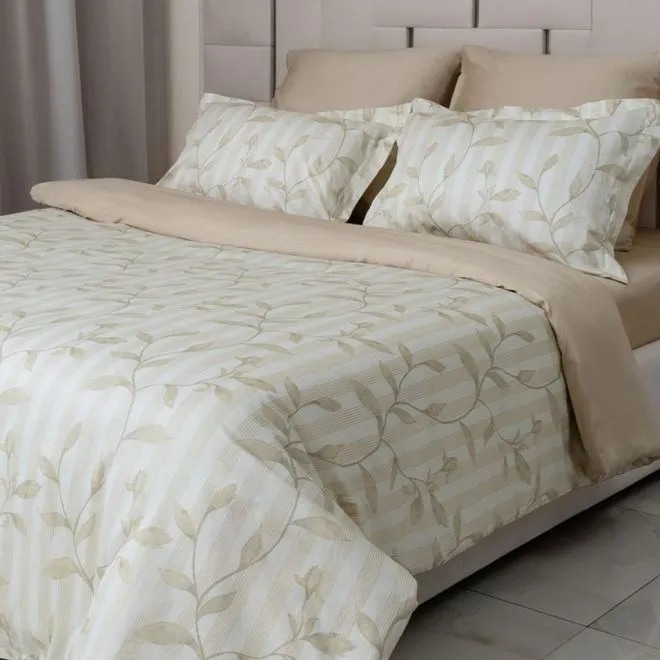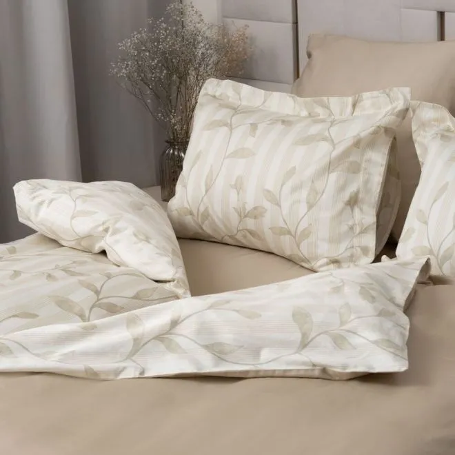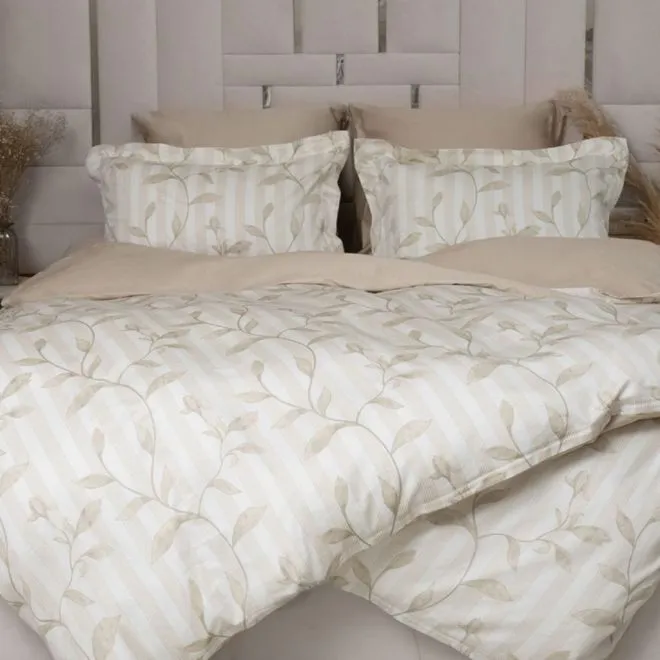Две однотонные наволочки, простыня и изнаночная сторона пододеяльника выполнены в бежевом цвете, а другие две наволочки и лицевая сторона пододеяльника украшены рисунком и сочетают в себе все четыре цвета.