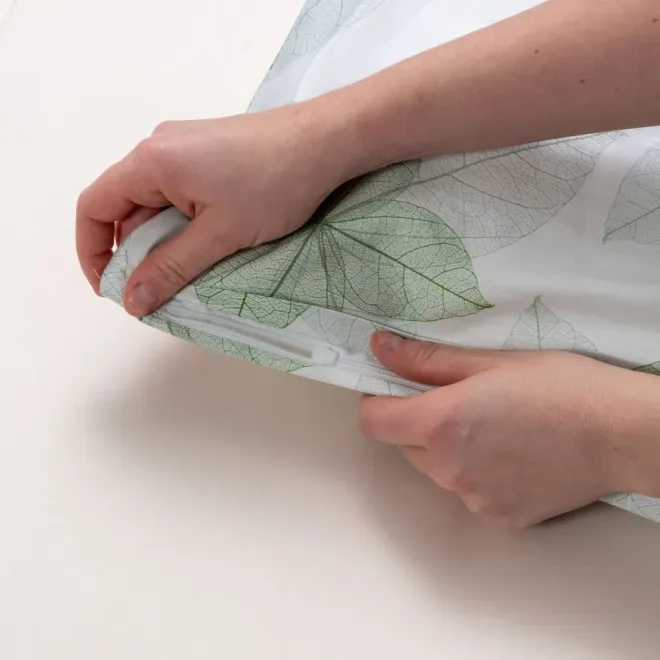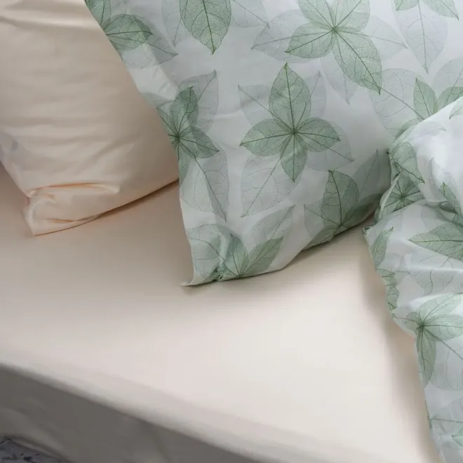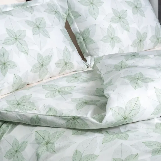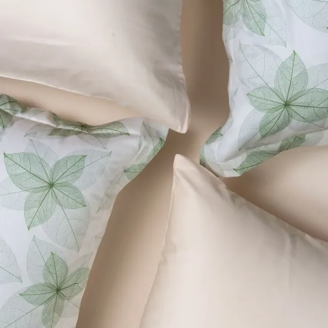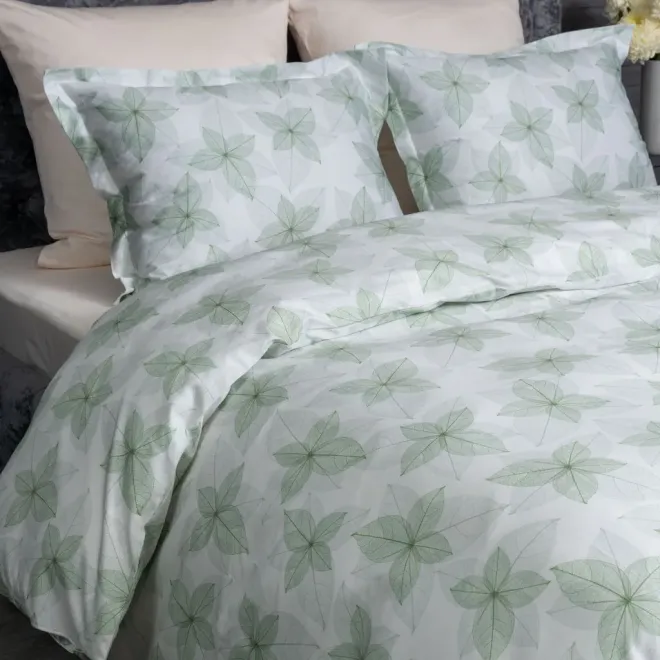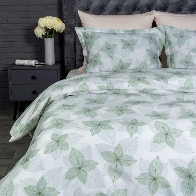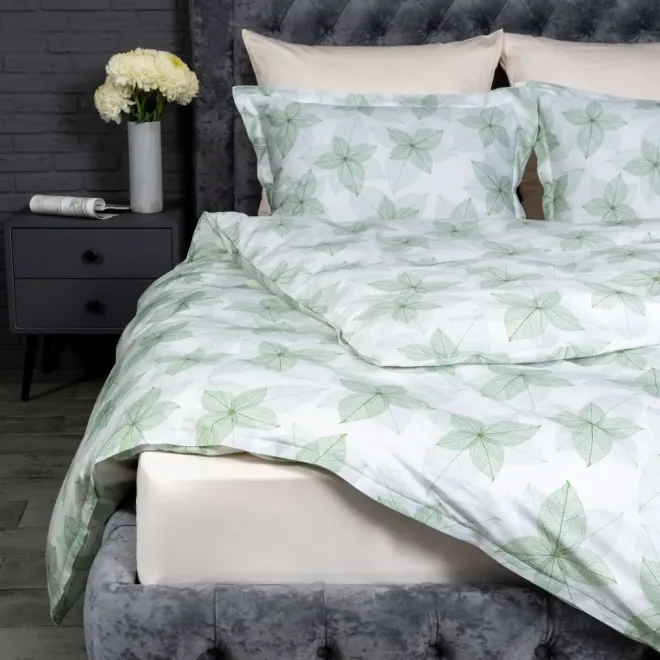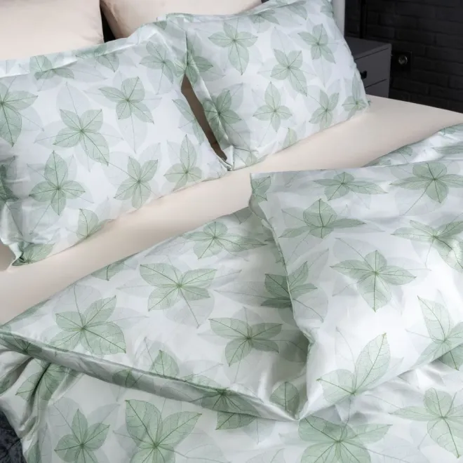 Постельное белье «Карамбола» выполнено в расслабляющей и в то же время освежающей гамме из нескольких оттенков зеленого цвета, расположившихся на хрустящем белом фоне. Входящие в комплект пододеяльник и две наволочки украшены многослойными акварельными изображениями листьев с тонкой, графичной прорисовкой прожилок. Другие две наволочки и простыня выполнены из однотонной ткани-компаньона цвета шампань. Для удобства смены белья пододеяльник дополнен клапанами для рук и застежкой-молнией во всю ширину изделия. Все наволочки имеют застежки-клапаны, а наволочки в размере 50х70 сантиметров дополнены декоративными бортиками-ушками. Комплект постельного белья «Карамбола» из благородного мако-сатина – прекрасный подарок себе и близким!