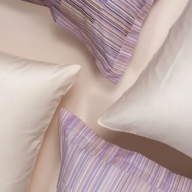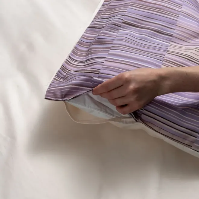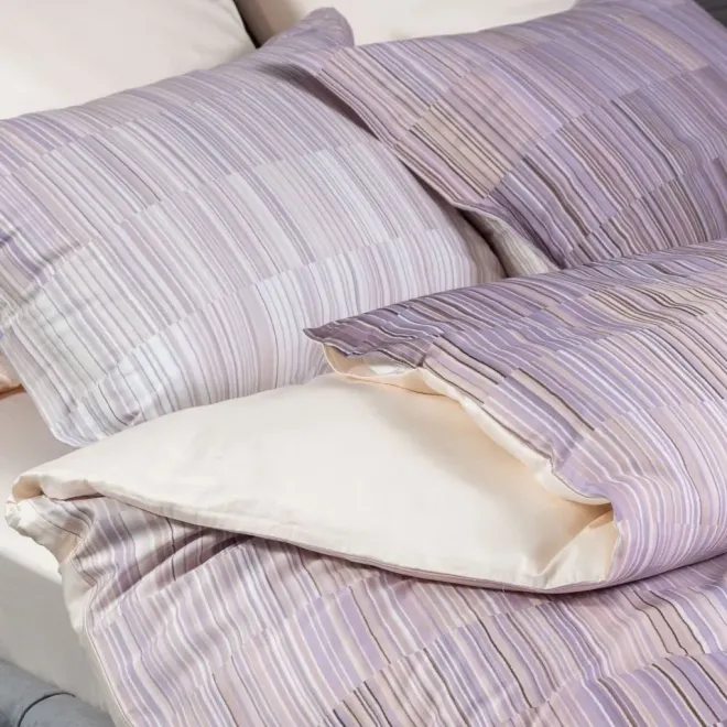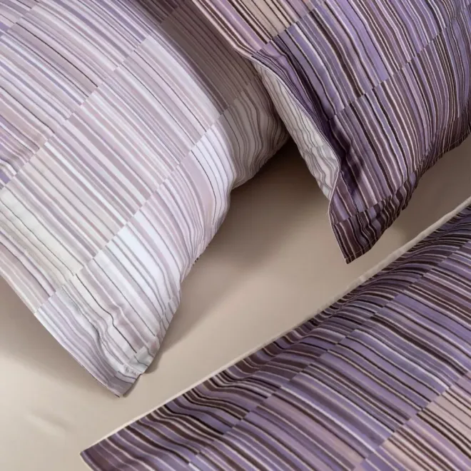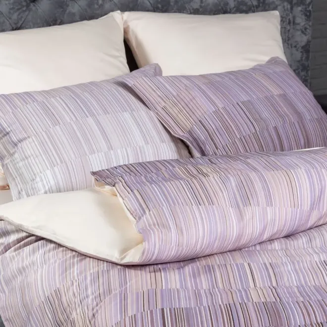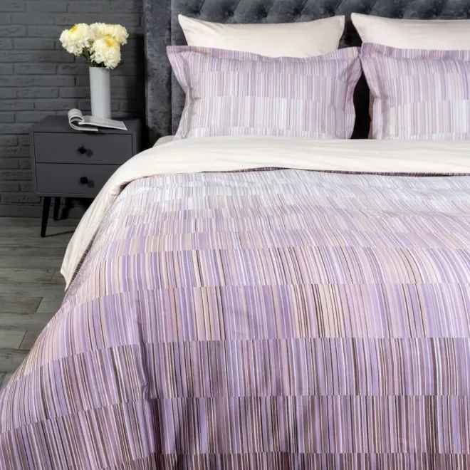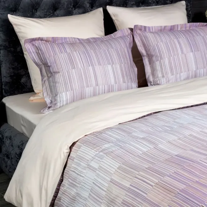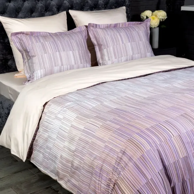 Постельное белье «Элемент» выполнено в нежной цветовой гамме. Солирует в ней изысканный оттенок «сиреневый мрамор», а аккомпанируют ему оттенки бежевого с разным подтоном. Комбинация этих цветов создает эффект градиентной растяжки от темного оттенка к светлому и наоборот. Входящие в комплект пододеяльник и две наволочки украшены геометрическим абстрактным принтом – узнаваемым элементом современного стиля с легкой ноткой романтики. Другие две наволочки, простыня и изнаночная сторона пододеяльника выполнены из однотонной ткани-компаньона в оттенке шампань. Для удобства смены белья пододеяльник дополнен клапанами для рук и застежкой-молнией во всю ширину изделия. Все наволочки имеют удобные клапаны, а наволочки в размере 50х70 сантиметров дополнены декоративными бортиками-ушками. Комплект постельного белья «Элемент» из благородного мако-сатина – прекрасный подарок себе и близким!