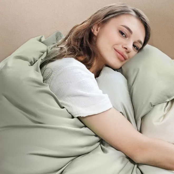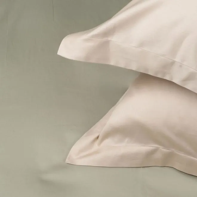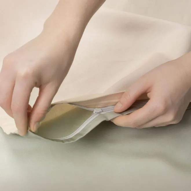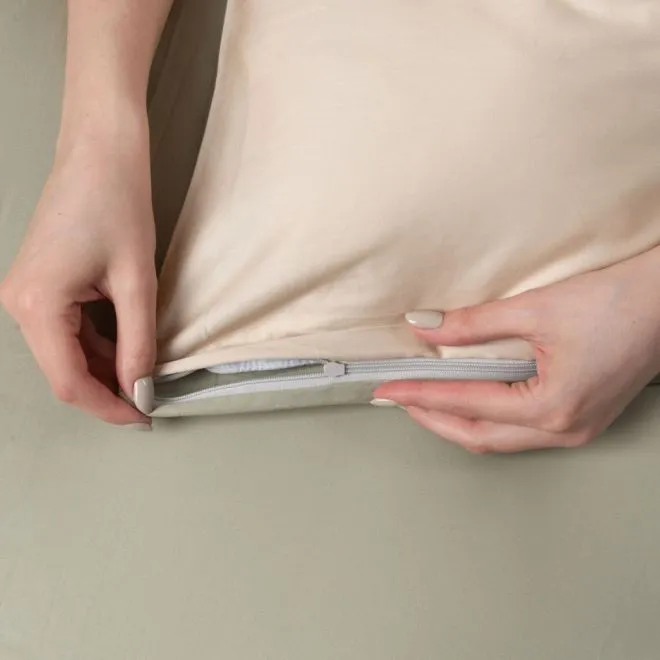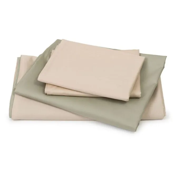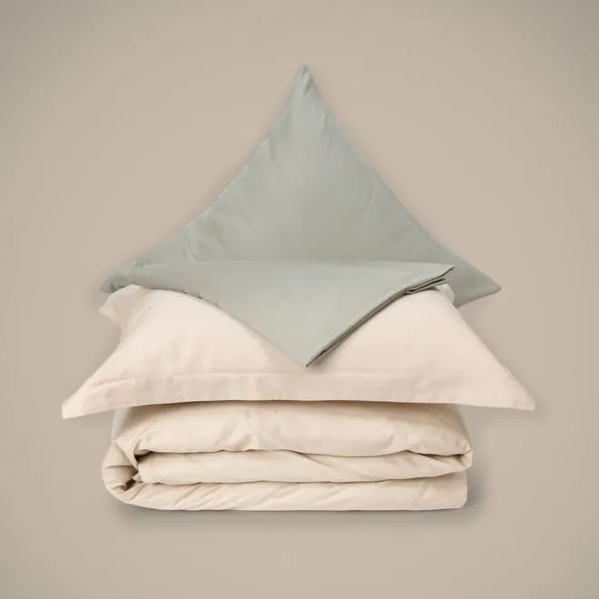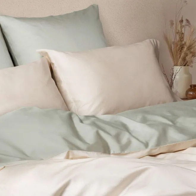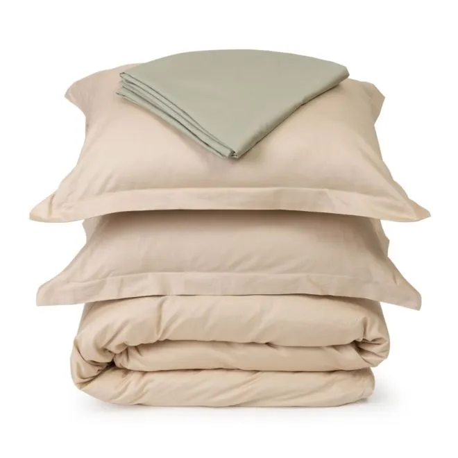 Пододеяльник в нижней части закрывается на скрытую молнию с пуллером – собачка в ней отсутствует и поэтому она не сломается и не будет цепляться за ткань. Наволочки закрываются на удобный, глубокий клапан, который позволяет надежно фиксировать подушку. Две наволочки, простыня и внутренняя сторона пододеяльника выполнены в зеленом оттенке люцерны, а две другие наволочки и лицевая сторона пододеяльника – в оттенке пергамента.