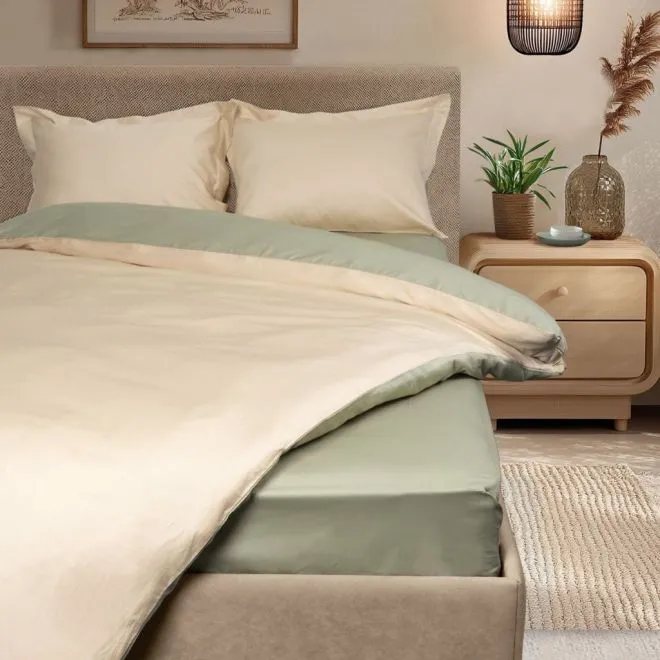 Входящие в комплект наволочки, простыни и пододеяльники выполнены в мягкой натуральной гамме – сочетании зеленого и бежевого оттенков.