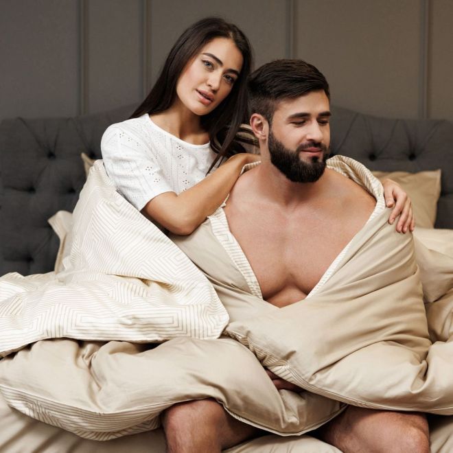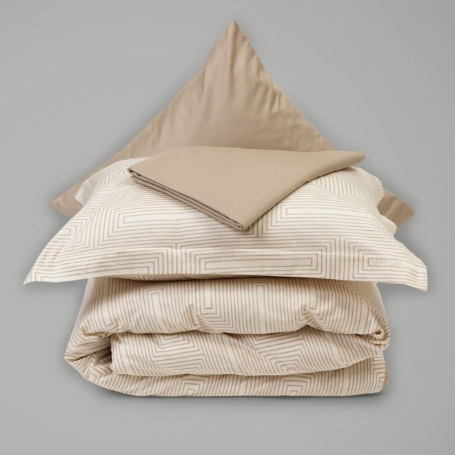 Комплект «Иллюзия» выполнен в сочетании оттенка «ванильный лед» и бежевого. Умиротворяющая цветовая гамма дополнена ненавязчивым геометрическим принтом с иллюзией 3D-эффекта.