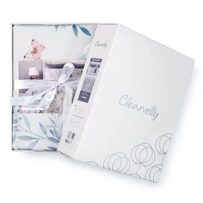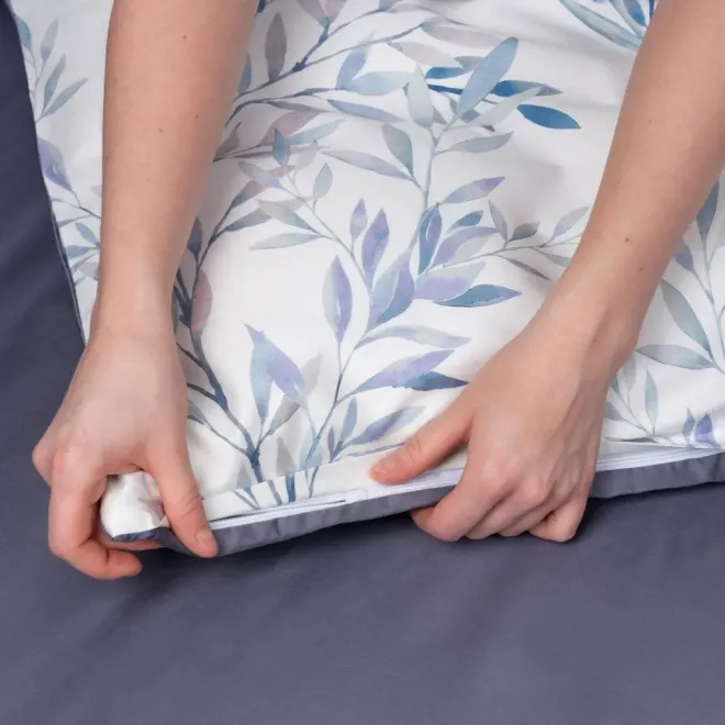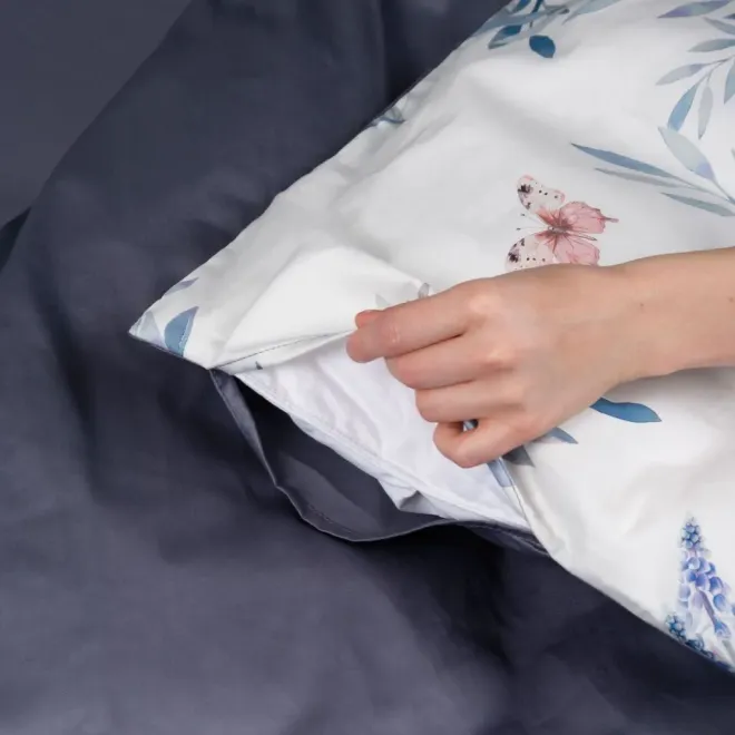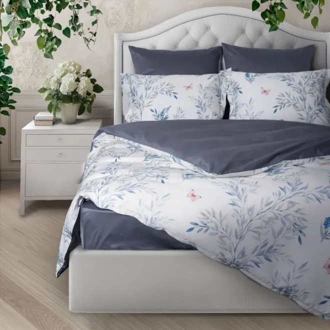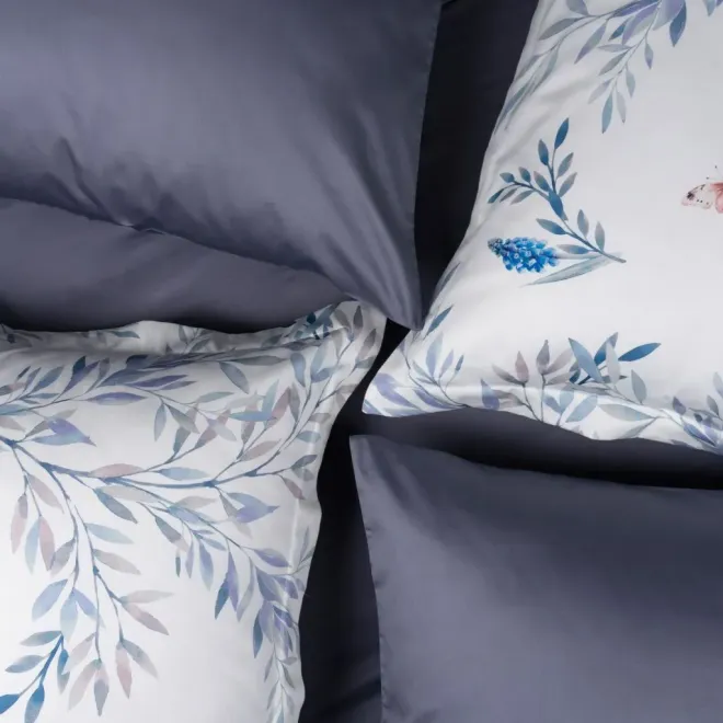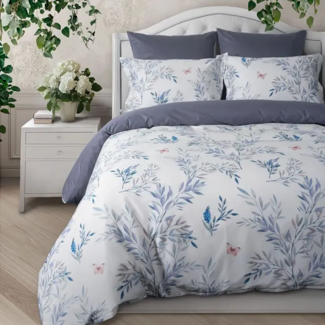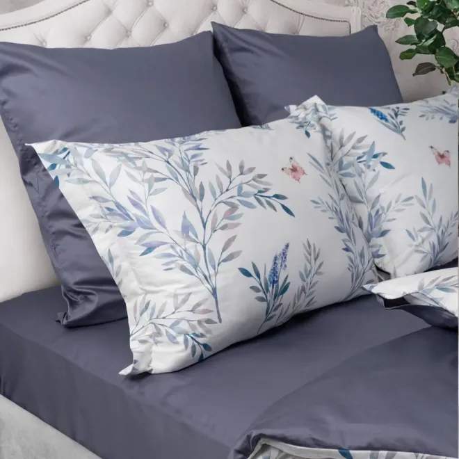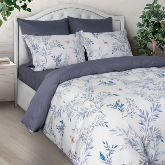 Комплект «Нектар» выполнен в изящной, умиротворяющей гамме – на белом фоне особенно нежно смотрятся лавандовый, конфетно-розовый, кобальтовый, темно-синий и серо-зеленый оттенки. Входящие в комплект пододеяльник и две наволочки украшены изображениями веточек растений, цветов и бабочек в акварельной технике. Другие две наволочки и простыня выполнены из однотонной ткани-компаньона в серо-синем оттенке ириса. Для удобства смены белья пододеяльник дополнен клапанами для рук и застежкой-молнией во всю ширину изделия. Все наволочки имеют удобные клапаны, а наволочки в размере 50х70 сантиметров дополнены декоративными бортиками-ушками. Комплект постельного белья «Нектар» из благородного мако-сатина – прекрасный подарок себе и близким!