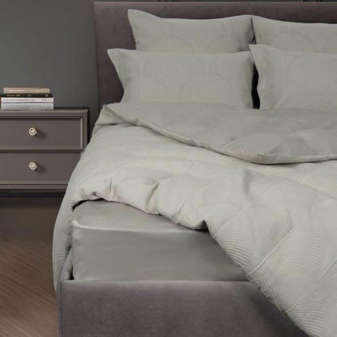 Комплект «Платан», выполненный в мягком серо-голубом цвете, украсит интерьер спален в неоклассическом стиле. Он дарит двойное удовольствие от прикосновения к разным фактурам и выполняет две полезных функции.