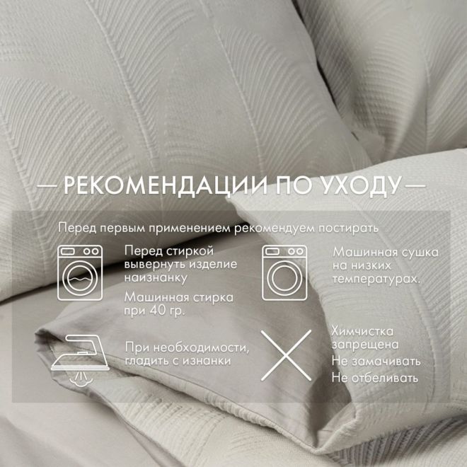 Рекомендации по уходу. Изделия из сатина рекомендуется стирать при температуре не выше 40 градусов с использованием качественных средств для стирки, допускается сушка в машинке. При необходимости белье можно прогладить его в слегка влажном состоянии при температуре не выше 150 градусов. Отбеливание и сухая чистка запрещены.
