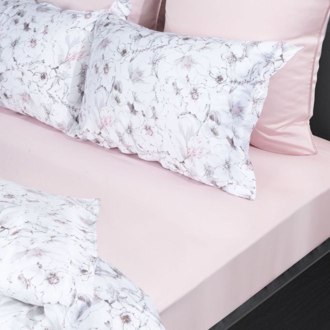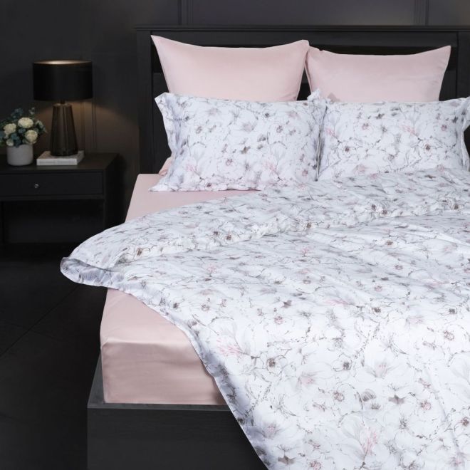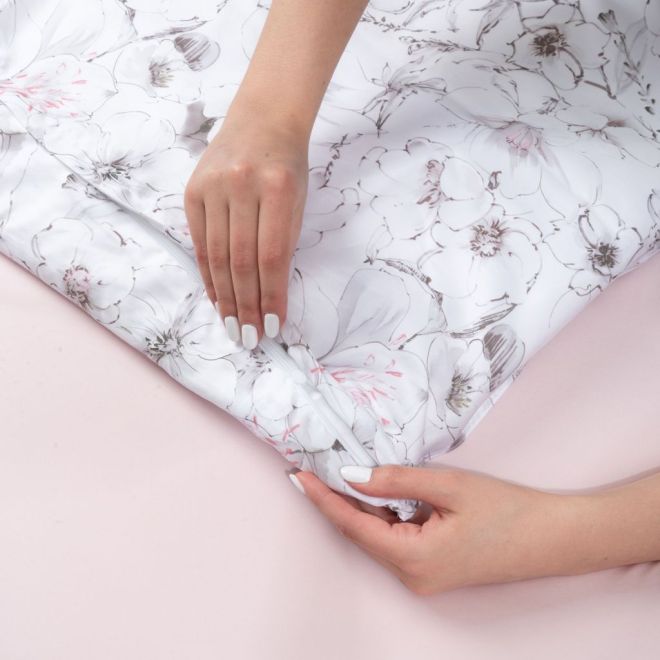 В состав евро-комплекта входят 2 наволочки с ушками 50х70 см с клапаном, 2 наволочки 70х70 см на молнии, пододеяльник 200х220 см и простыня 240х260 см (подходит для высоких матрасов размером 160х200 см и 180х200 см). Пододеяльник в нижней части закрывается на скрытую молнию с пуллером – собачка в ней отсутствует и поэтому она не сломается и не будет цепляться за ткань.