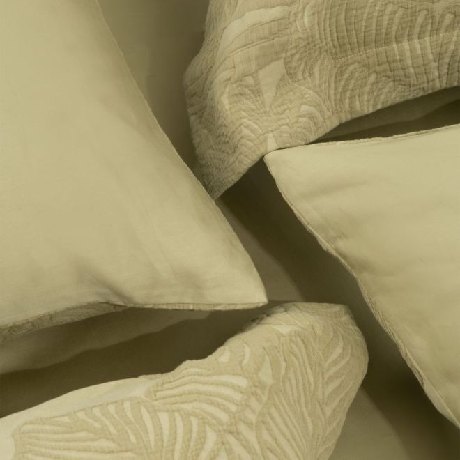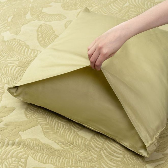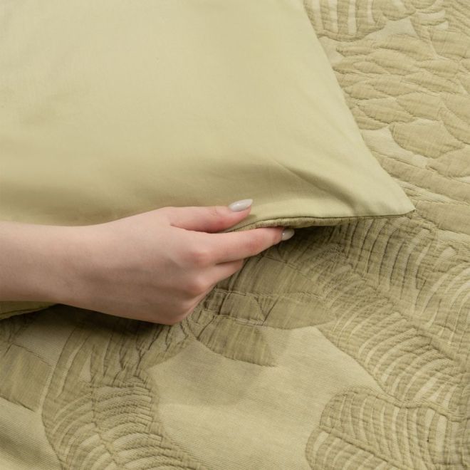 В состав евро-комплекта входят сатиновая простыня размером 240х260 см (подходит для большинства матрасов размером 160х200 см и 180х200 см), а также двусторонние пододеяльник 200х220 см, 2 наволочки см 50х70 и 2 наволочки 70х70 см. Пододеяльник закрывается на удобные и надежные пуговицы, а наволочки – на клапан. Комплект «Монстера», выполненный в жизнеутверждающем желто-фисташковом цвете и украшенный изображениями листьев монстеры, украсит интерьер спален в эко-стиле. Он дарит двойное удовольствие от прикосновения к разным фактурам и выполняет две полезных функции. Сатиновая сторона из натуральной пряжи – нежная, мягкая и шелковистая – обеспечивает комфортный сон. Сатин плотностью 200ТС прекрасно пропускает воздух и отводит влагу, создавая комфортный микроклимат в постели. Зимой такое постельное белье согреет, а летом приятно охладит. Вафельная сторона, также из 100% хлопка, имеет декоративную функцию. Просто переверните наволочки после сна и застелите кровать пододеяльником – и спальное место приобретет опрятный вид без дополнительных пледов и покрывал! Постельное белье «Монстера» обладает высокой прочностью и долговечностью. При правильном уходе такой комплект прослужит вам долгое время.